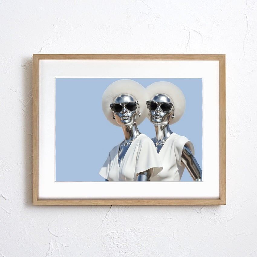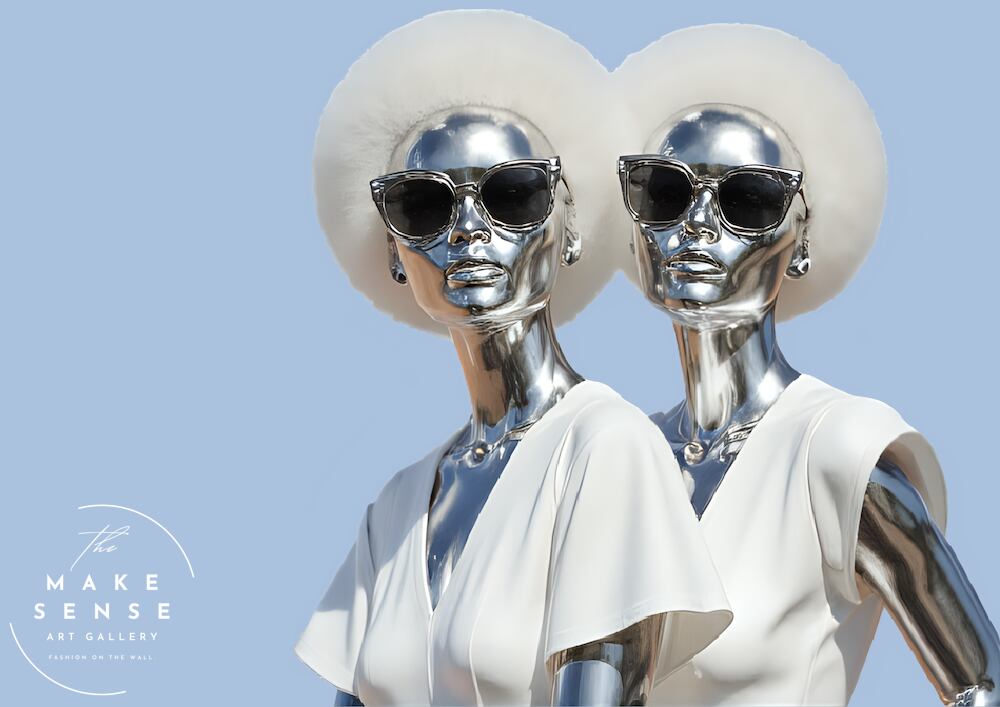 Chrome Twins|近未来ミニマルなシルバーフィギュアアートポスター|無機質と洗練が共存するファッション作品|A3ポスター