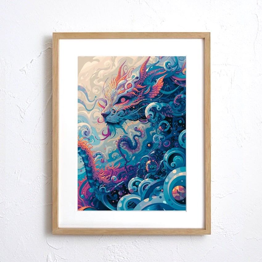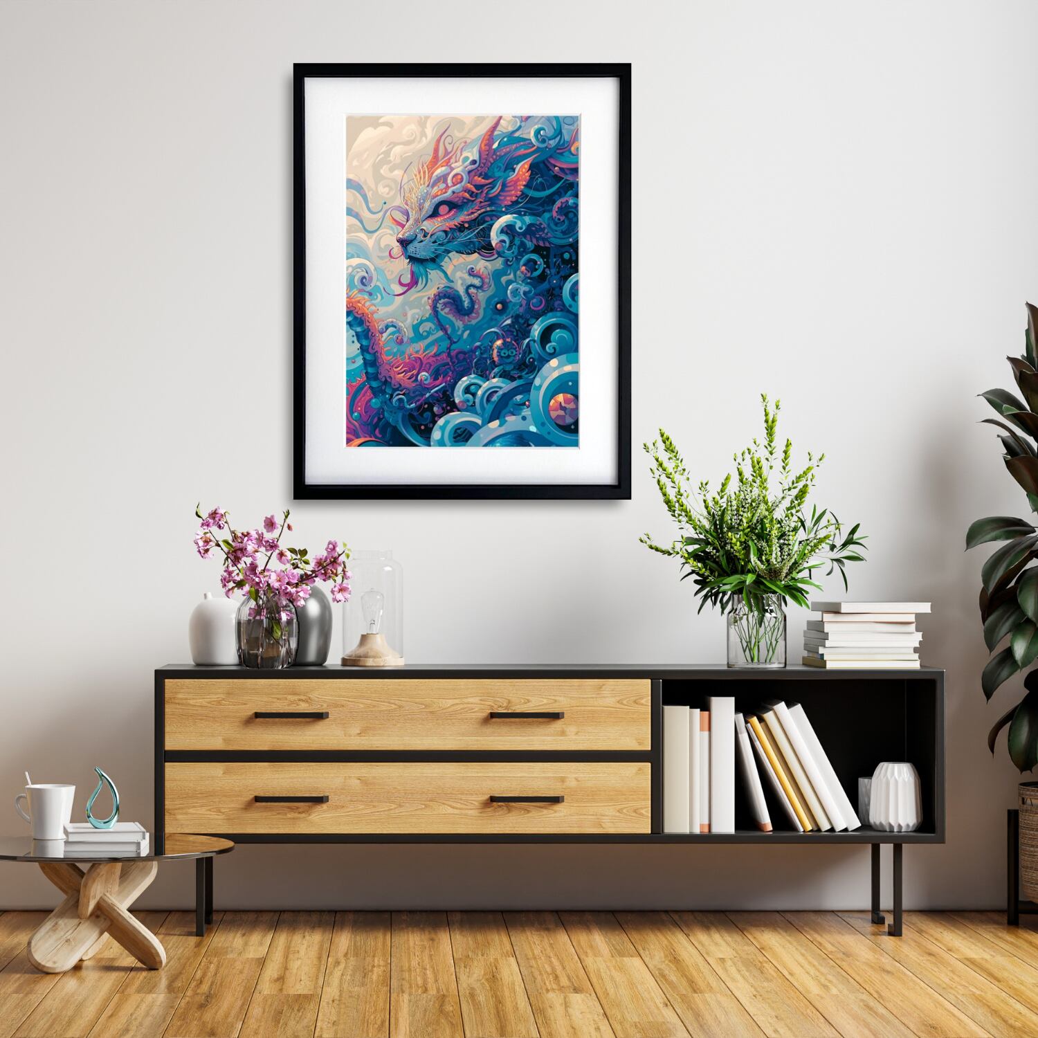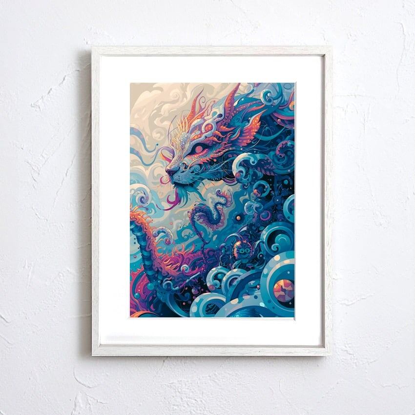 力強さと神秘性をあわせ持つドラゴンを、抽象的かつ流動的に描いたアートポスターです。