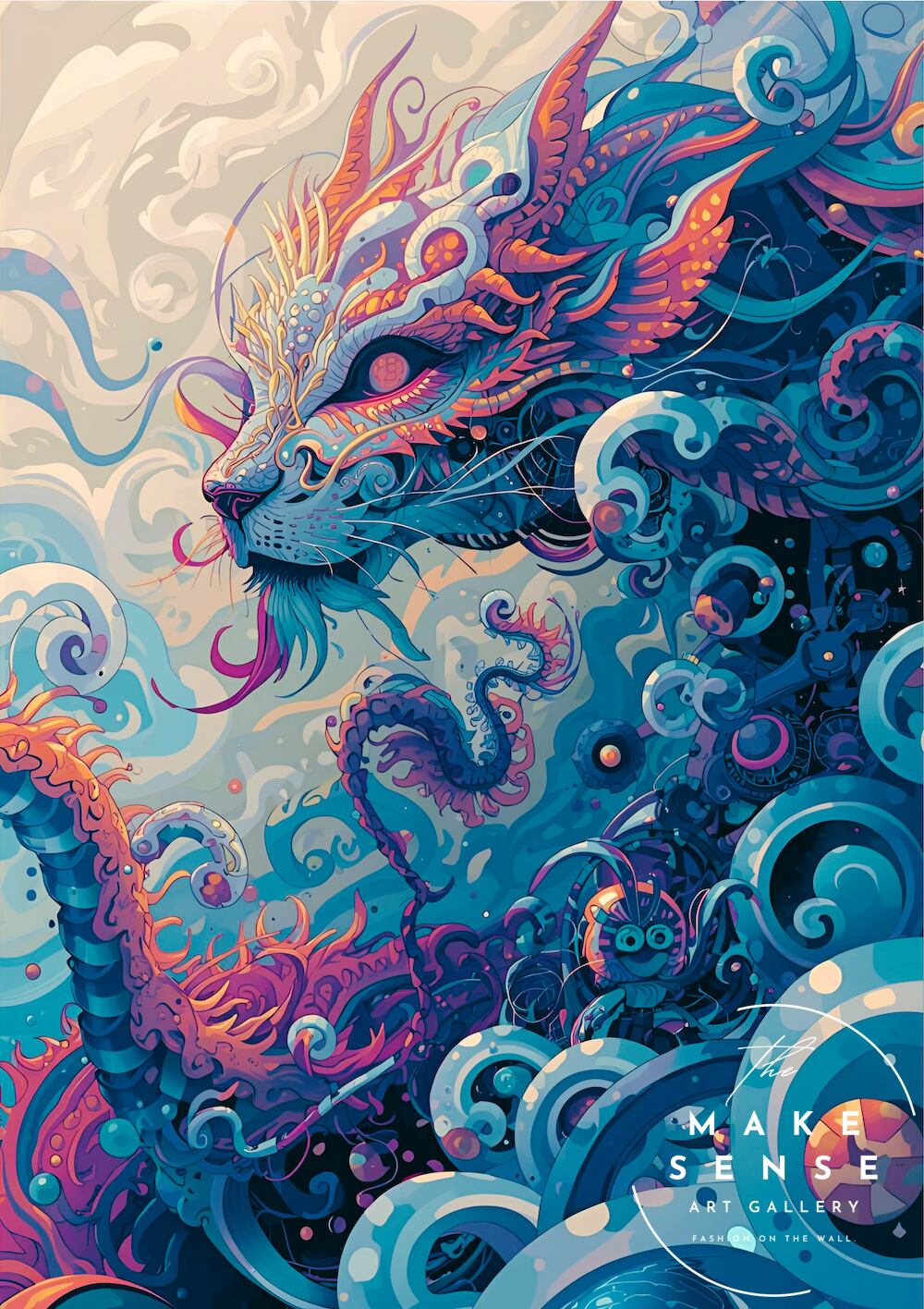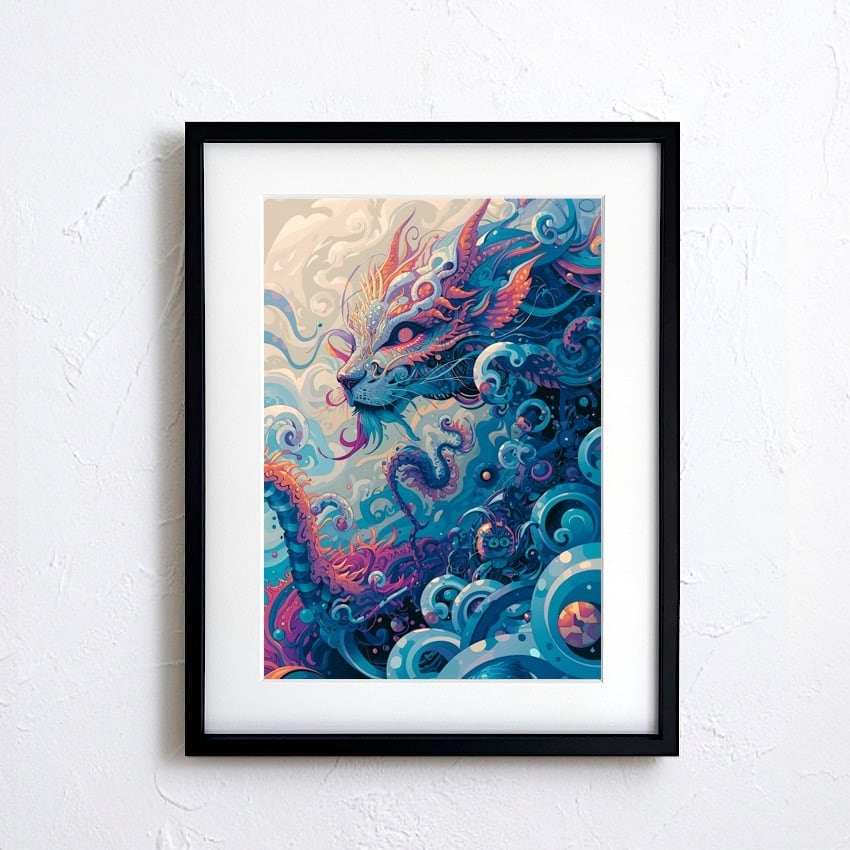 力強さと神秘性をあわせ持つドラゴンを、抽象的かつ流動的に描いたアートポスターです。