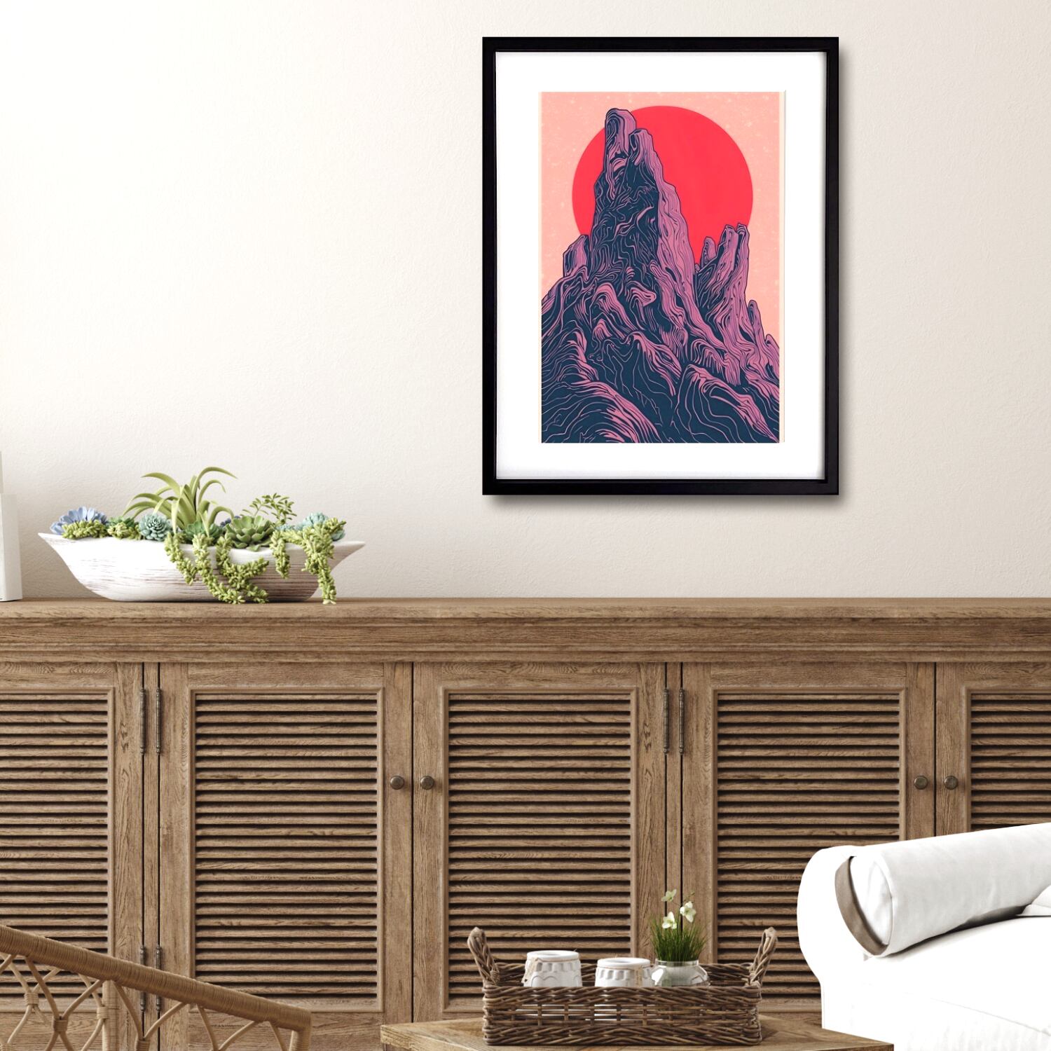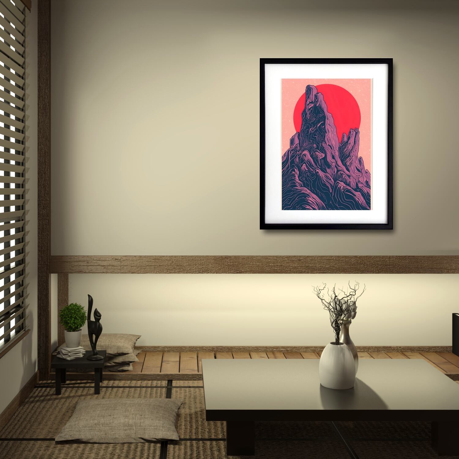 Crimson Peak Flow|赤い太陽と抽象山岳が描くモダンアートポスター|有機的ラインが印象的な現代風景画|A2ポスター