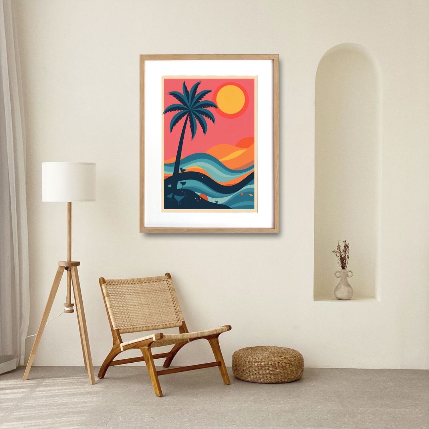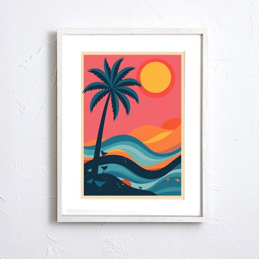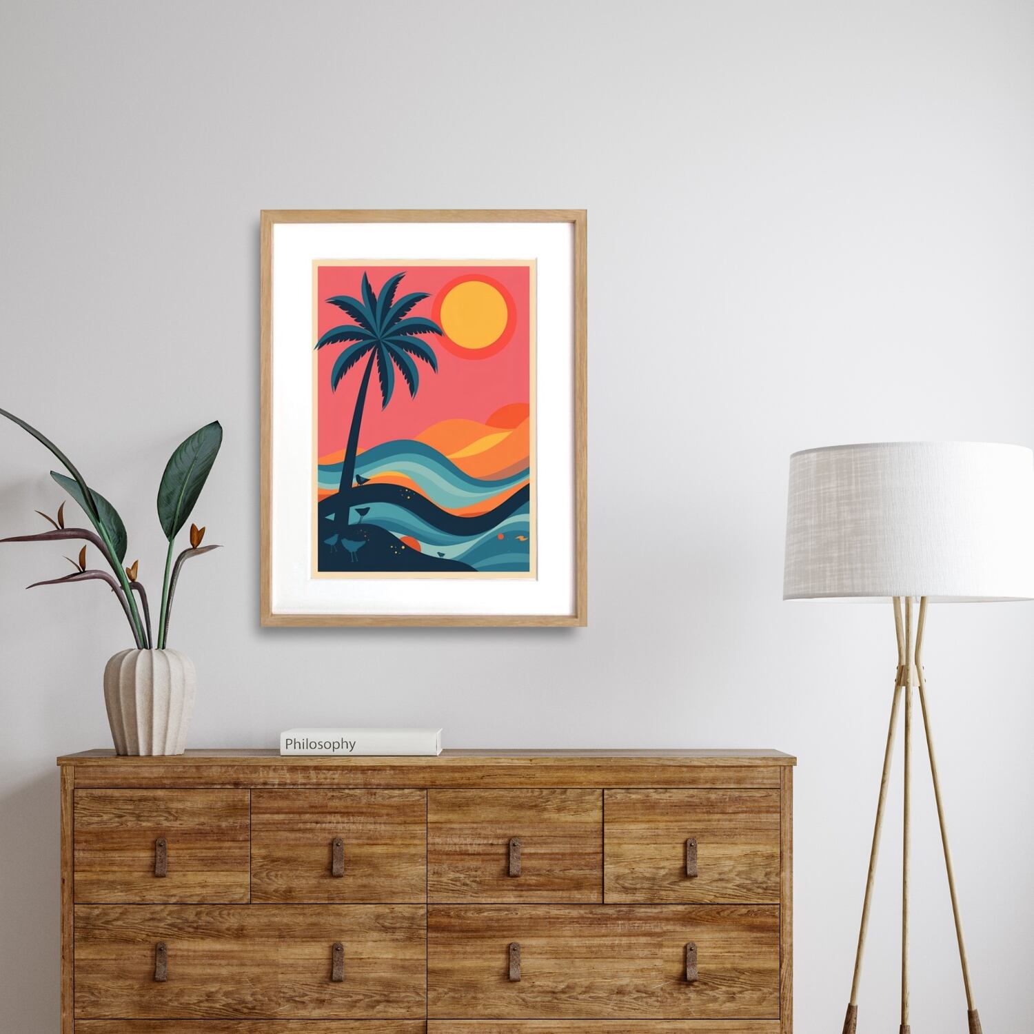 Sunset Palm Rhythm|夕陽とヤシが描く南国モダンアートポスター|波のリズムが心地よい抽象風景画|A3ポスター