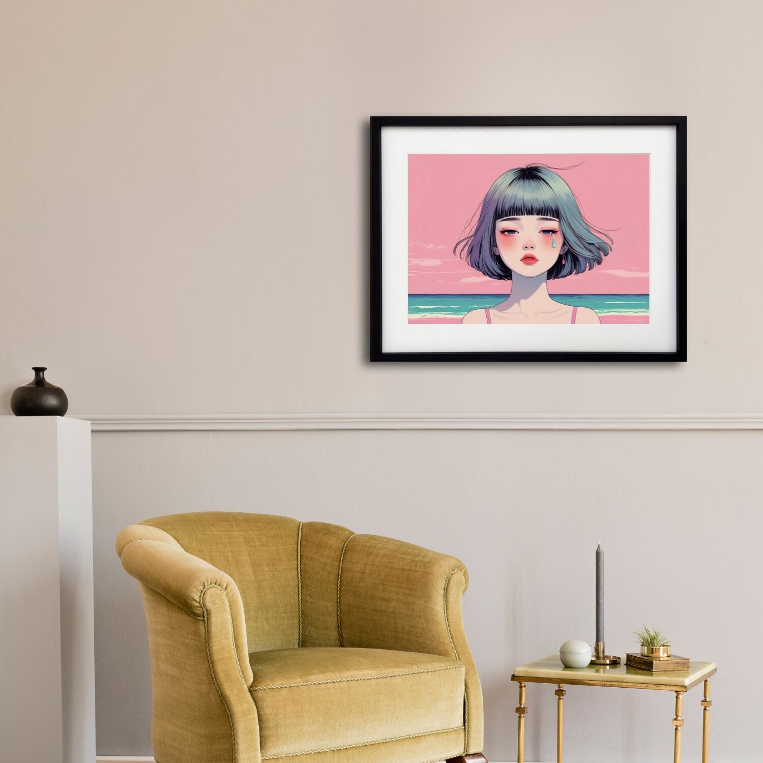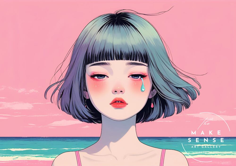 Pink Tide Tears|涙と海が溶け合うボブヘア少女のアートポスター|感情を映すピンクの空と静かな波|モダン人物画|A3ポスター