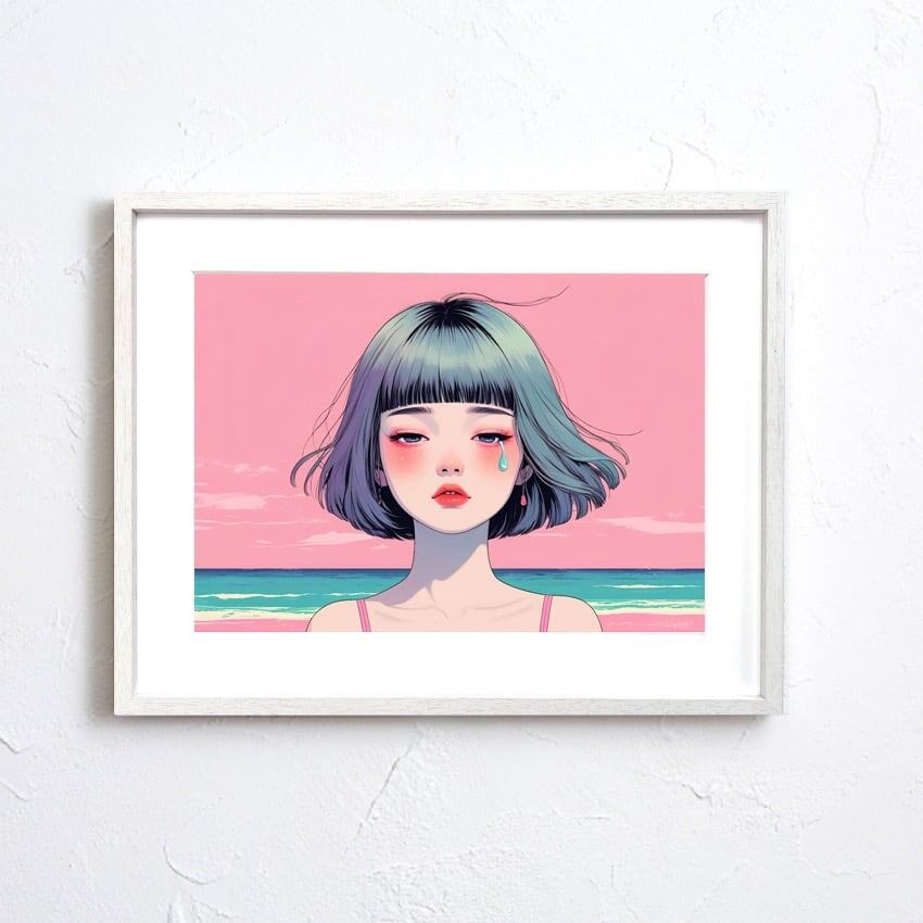 Pink Tide Tears|涙と海が溶け合うボブヘア少女のアートポスター|感情を映すピンクの空と静かな波|モダン人物画|A2ポスター