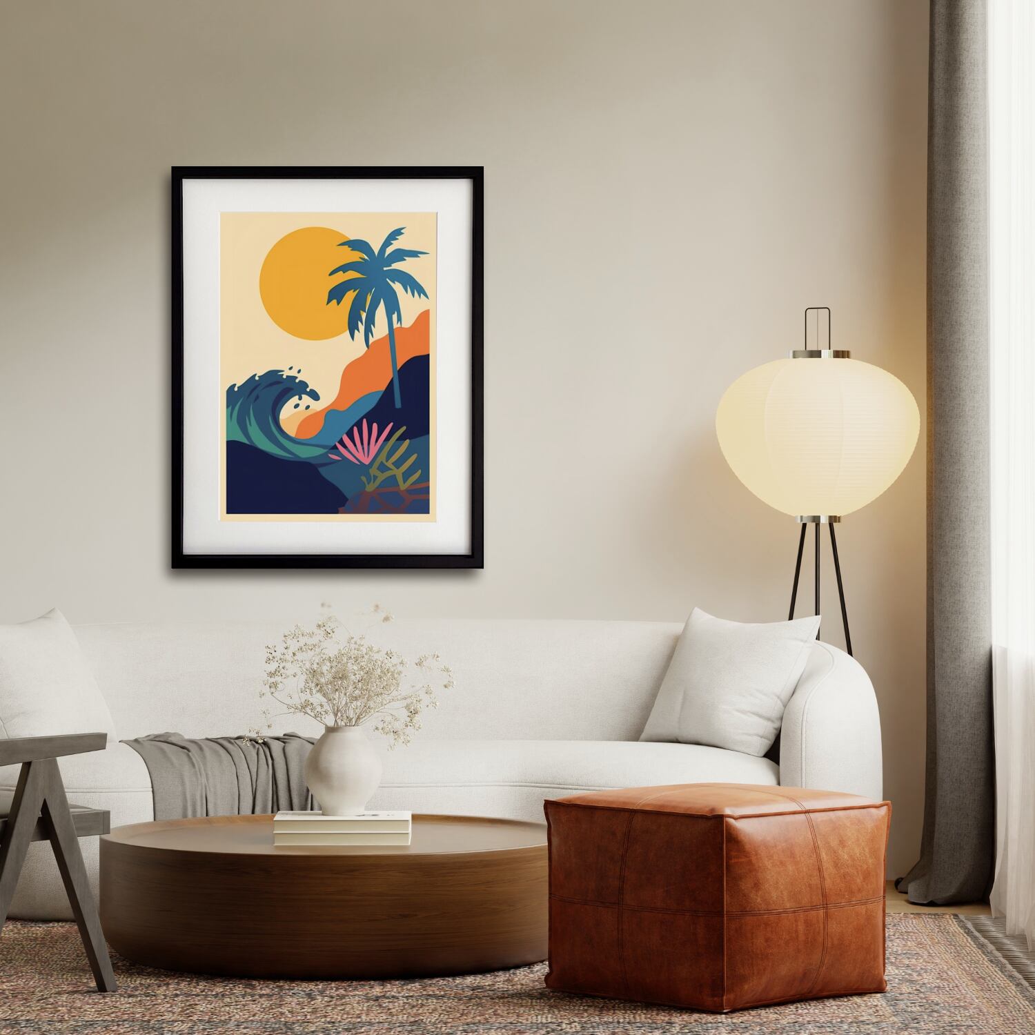Sunset Palm Wave|夕日とヤシが描く南国リゾートアートポスター|波と太陽の彩りで空間を非日常に|北欧モダン|A4ポスター