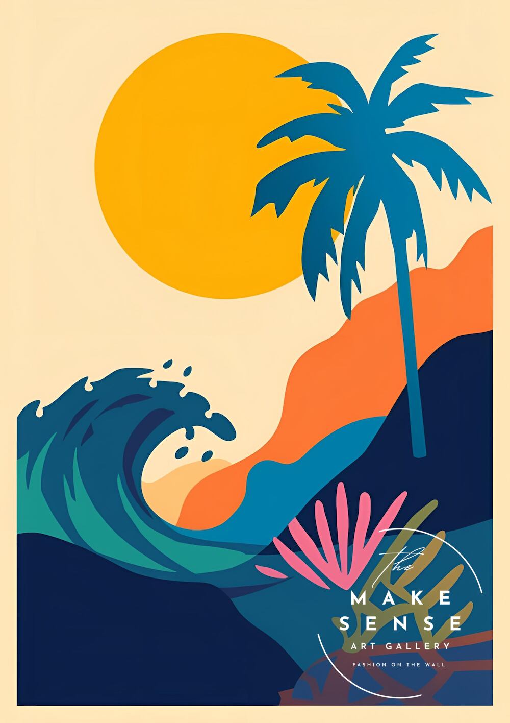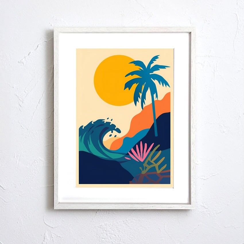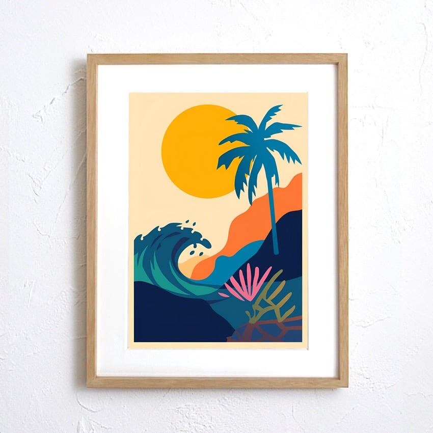 Sunset Palm Wave|夕日とヤシが描く南国リゾートアートポスター|波と太陽の彩りで空間を非日常に|北欧モダン|A3ポスター