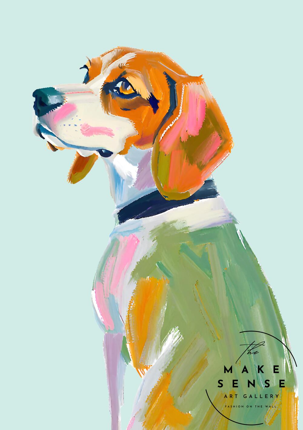 穏やかな表情のビーグル犬を、やさしい筆致と淡いカラーで描いたアートポスター。