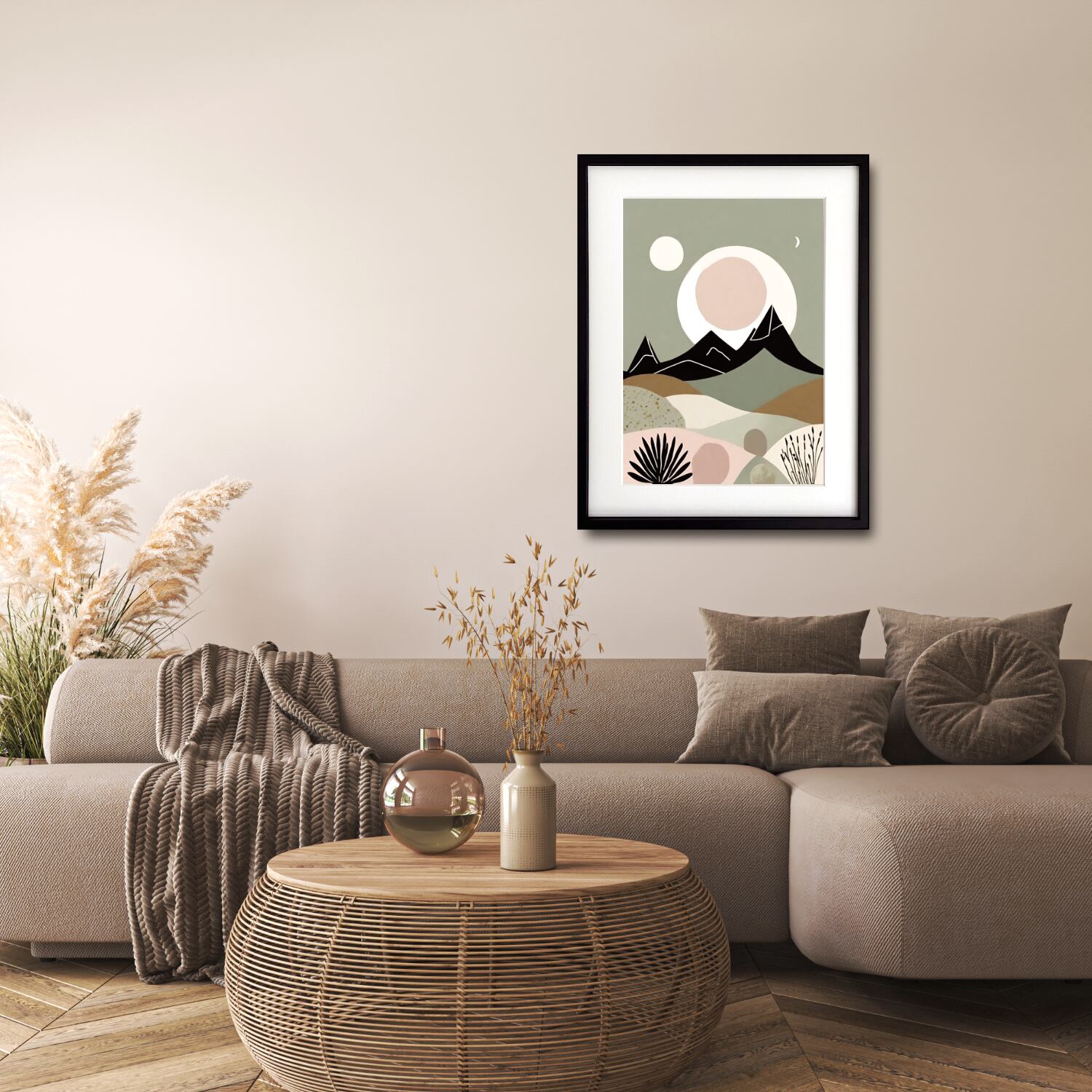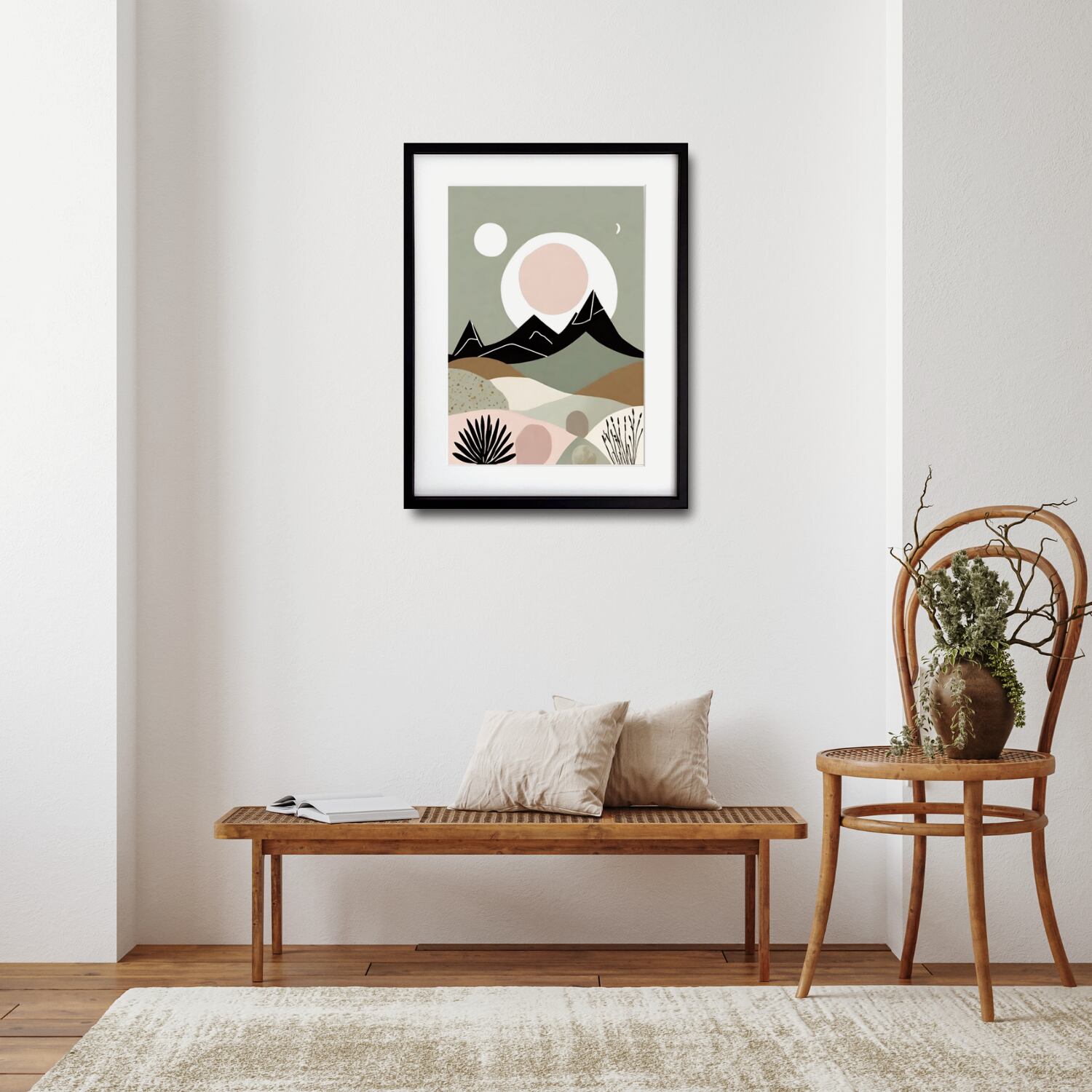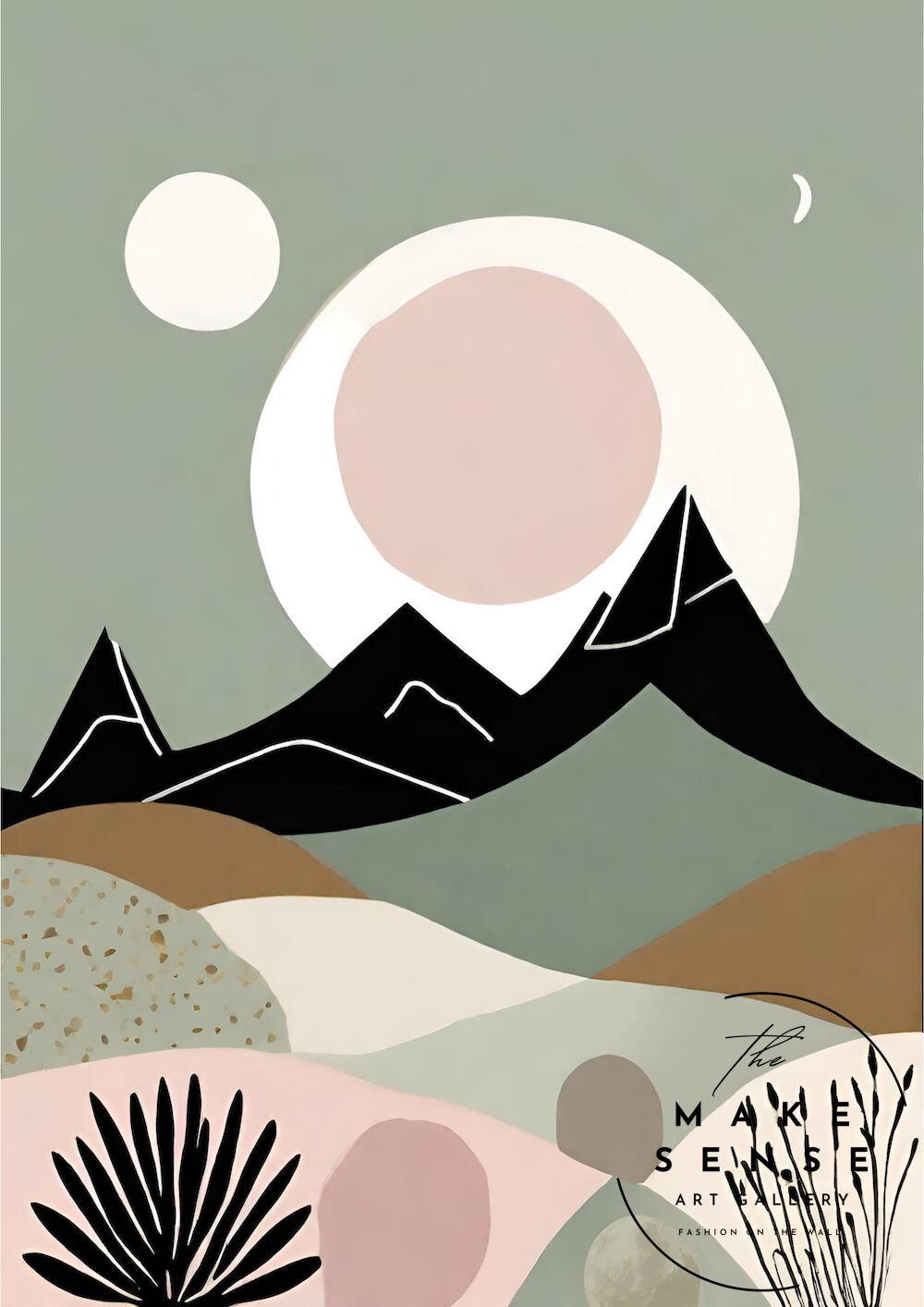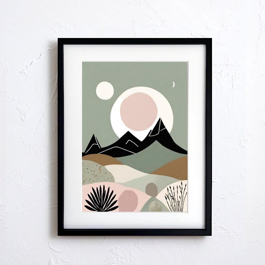 柔らかなグリーンとスモーキーピンクを基調に、山並みと月が静かに浮かぶ北欧ミニマルの風景アート。