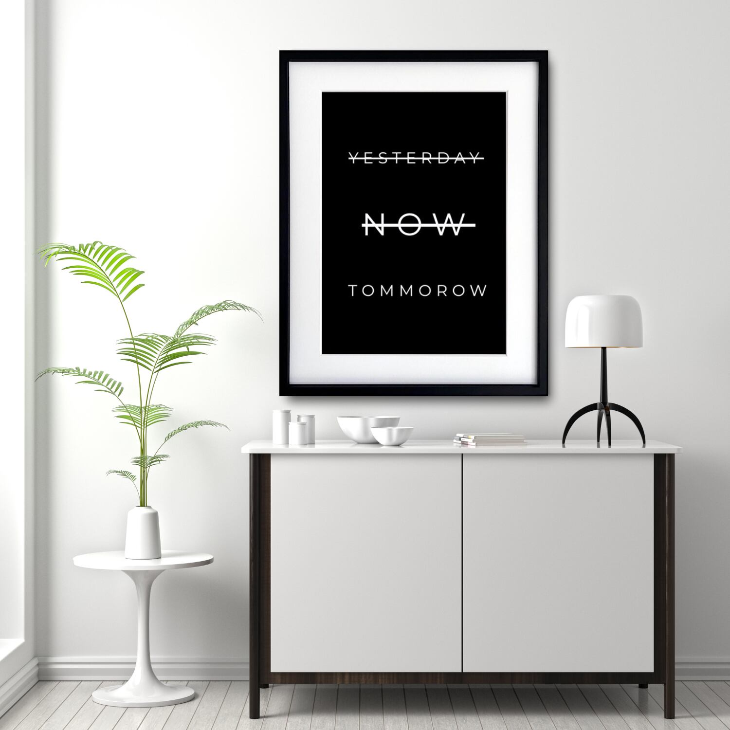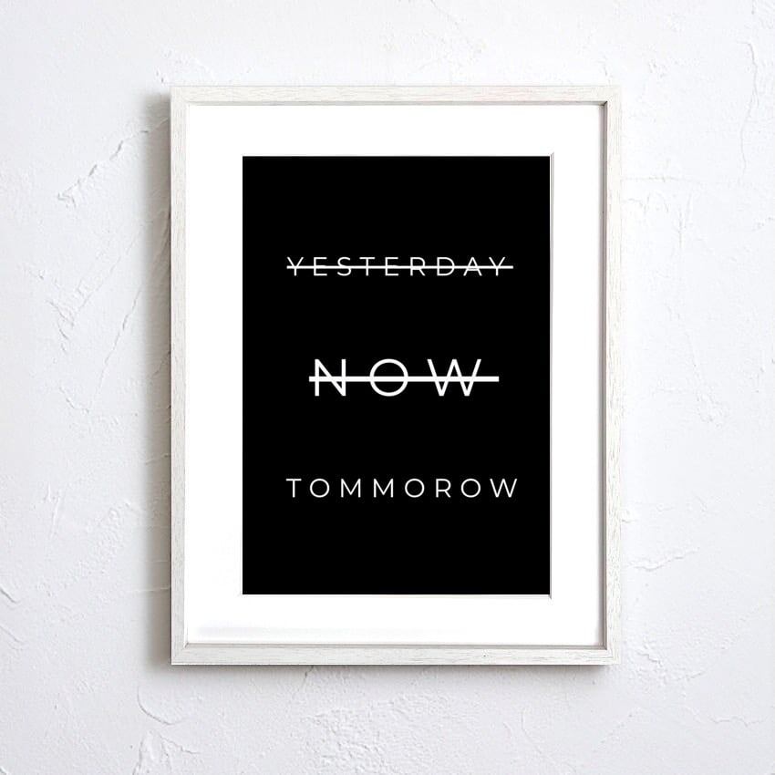 「YESTERDAY」「NOW」を消し、“TOMORROW”だけを残したミニマルテキストアート。