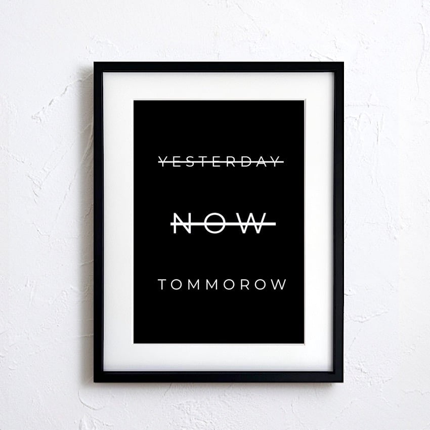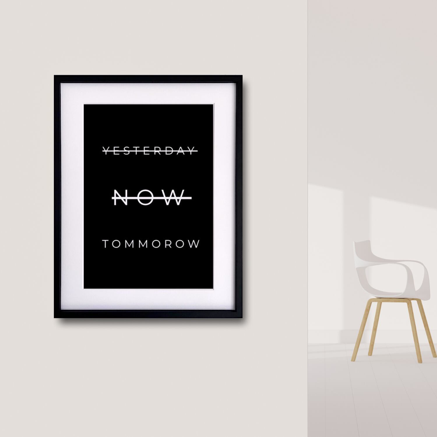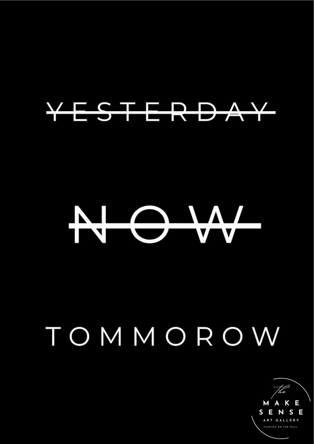 「YESTERDAY」「NOW」を消し、“TOMORROW”だけを残したミニマルテキストアート。
