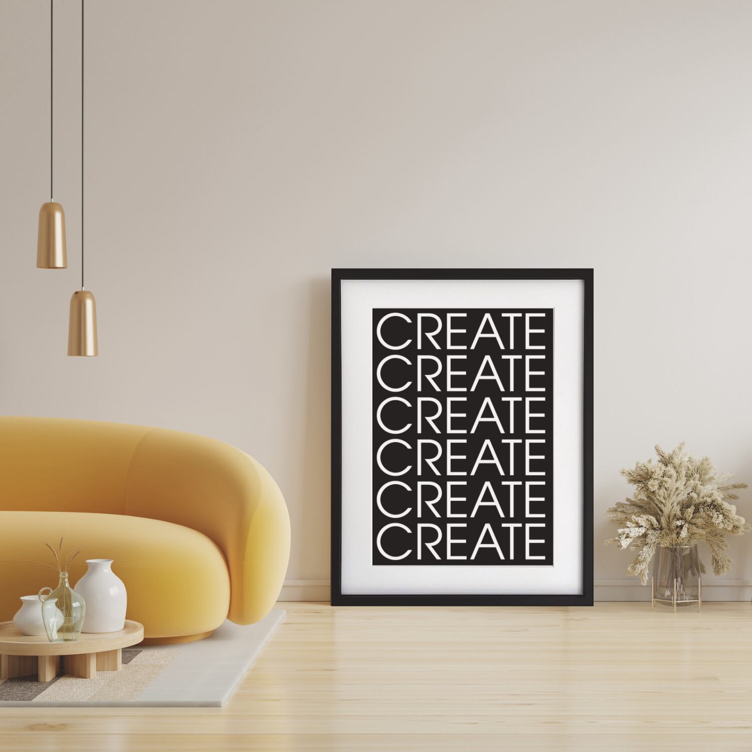 ミニマルで力強い“CREATE”を並べたテキストアート。白黒の強いコントラストが空間を引き締め、ワークスペースやモダンインテリアに最適。日常に「創造する力」を呼び込むスタイリッシュな一枚です。