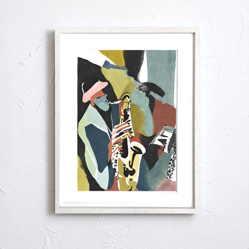 『Jazz Flow(ジャズ・フロー)』は、サックスプレイヤーが奏でる音の流れを抽象的な色彩で表現したアートポスター。
