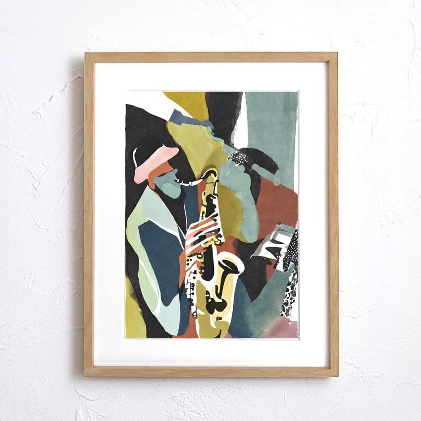 『Jazz Flow(ジャズ・フロー)』は、サックスプレイヤーが奏でる音の流れを抽象的な色彩で表現したアートポスター。