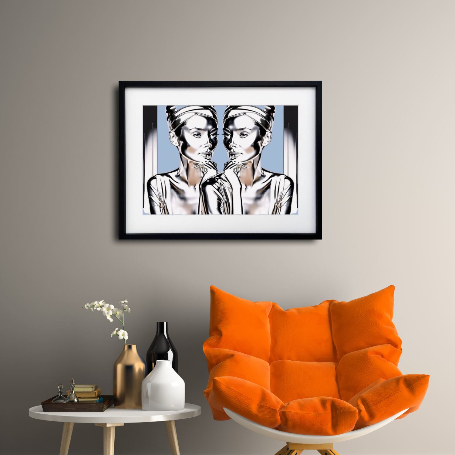 時を超えて輝く知性と気品を、未来的メタル質感で再構築したモダンアート。