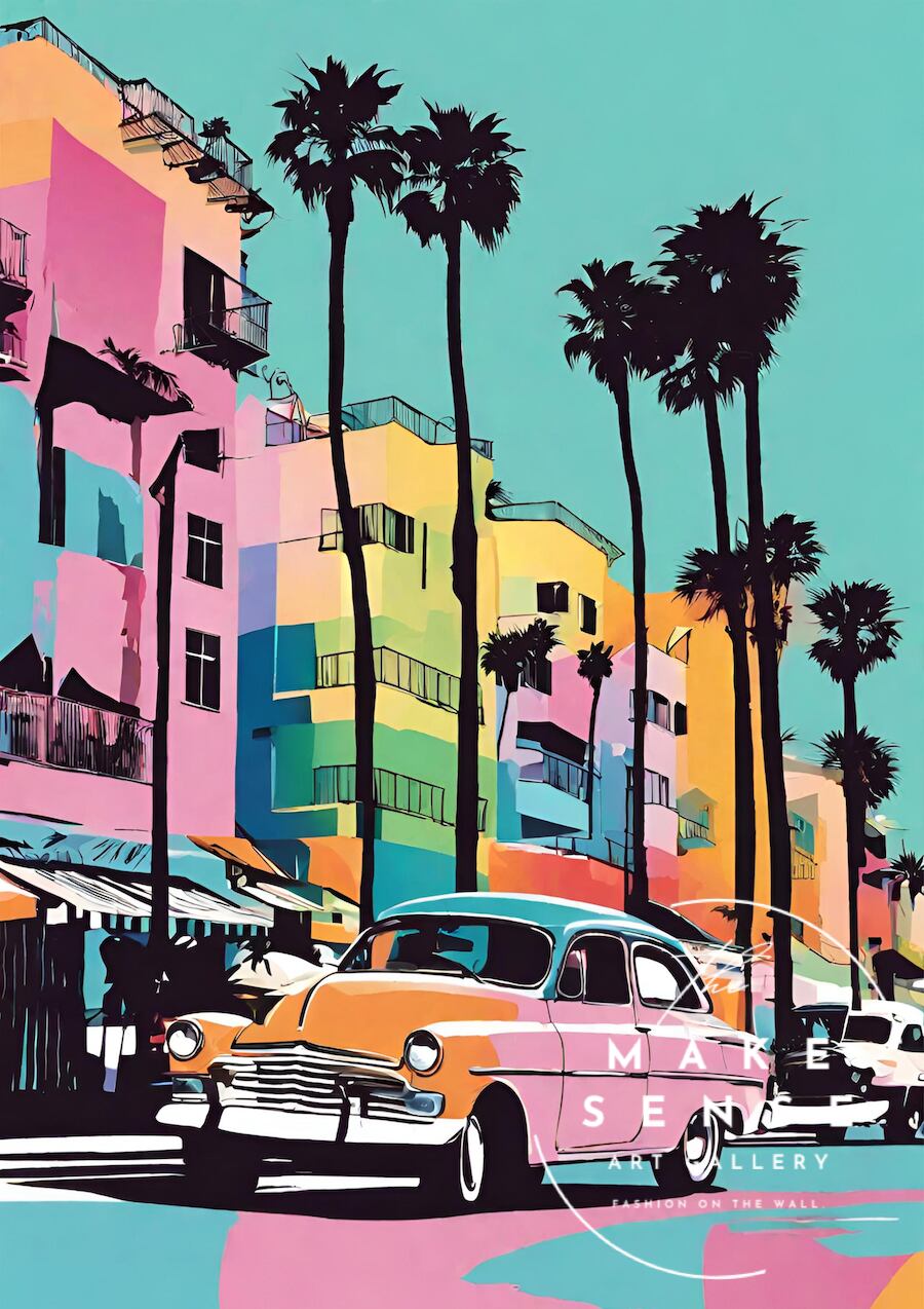 西海岸、サンタモニカの風景画。ヴィンテージのあるレトロテイストなポスター。ヴィンテージ、モダンなインテリアに相性良く、センスある部屋に変わります。