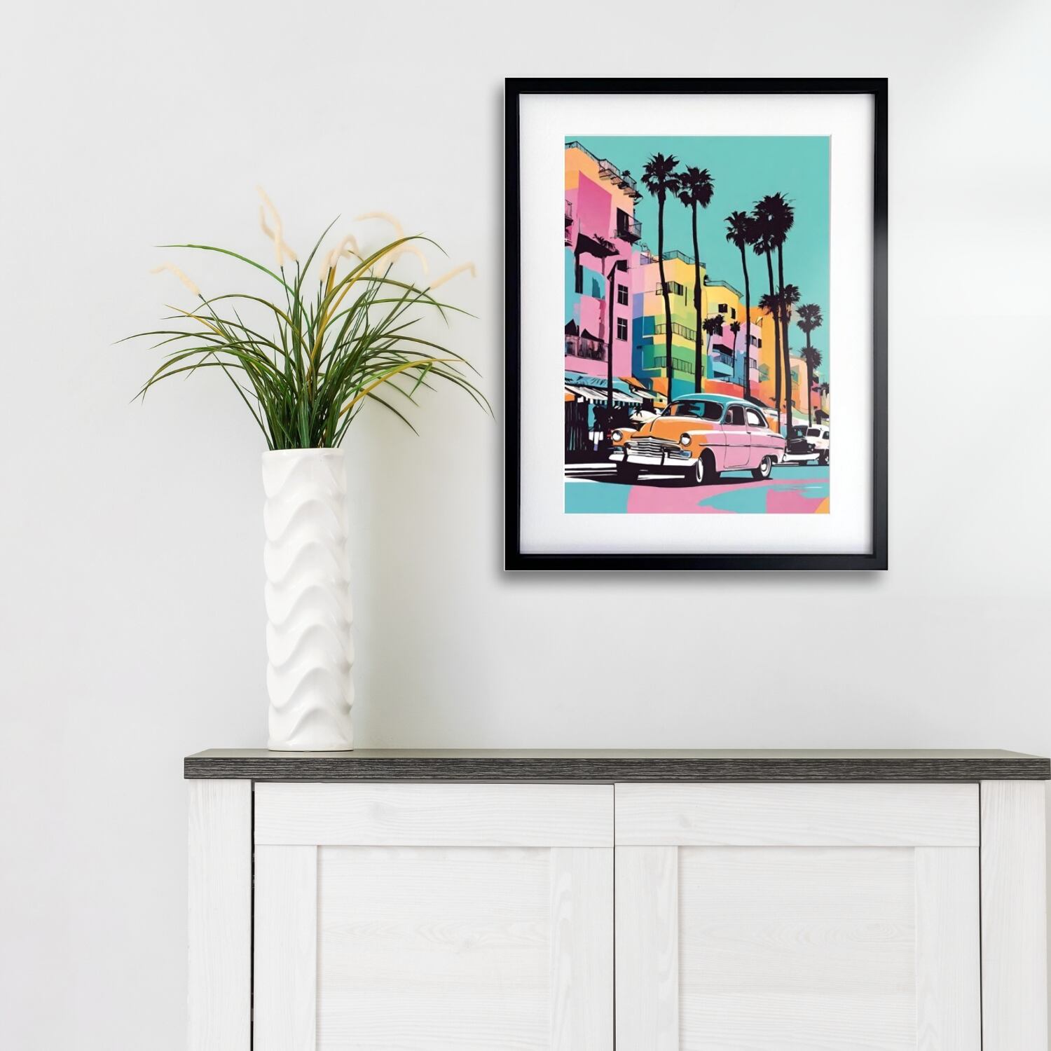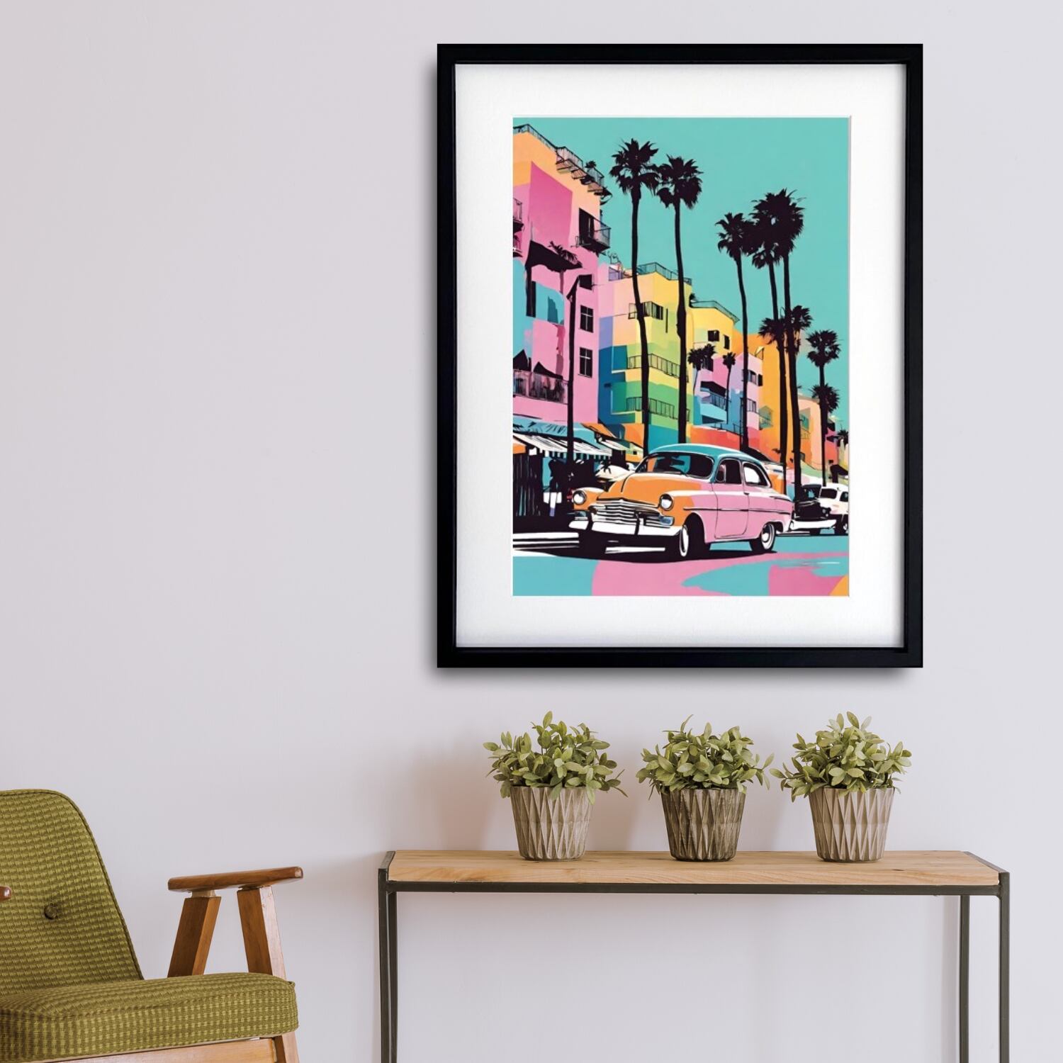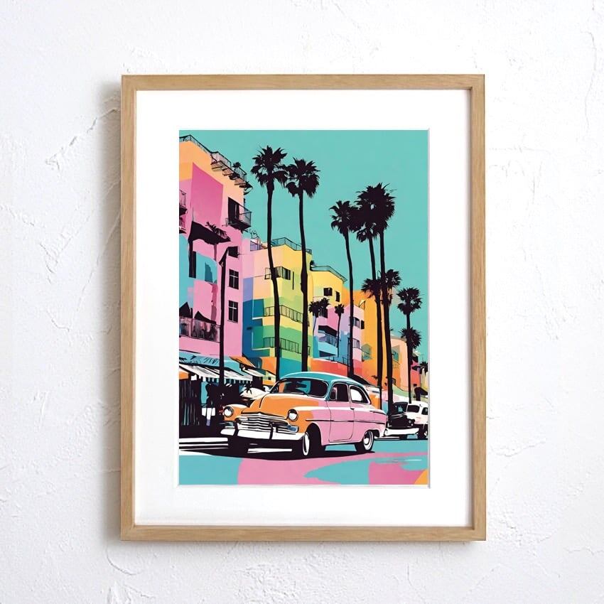 西海岸、サンタモニカの風景画。ヴィンテージのあるレトロテイストなポスター。ヴィンテージ、モダンなインテリアに相性良く、センスある部屋に変わります。