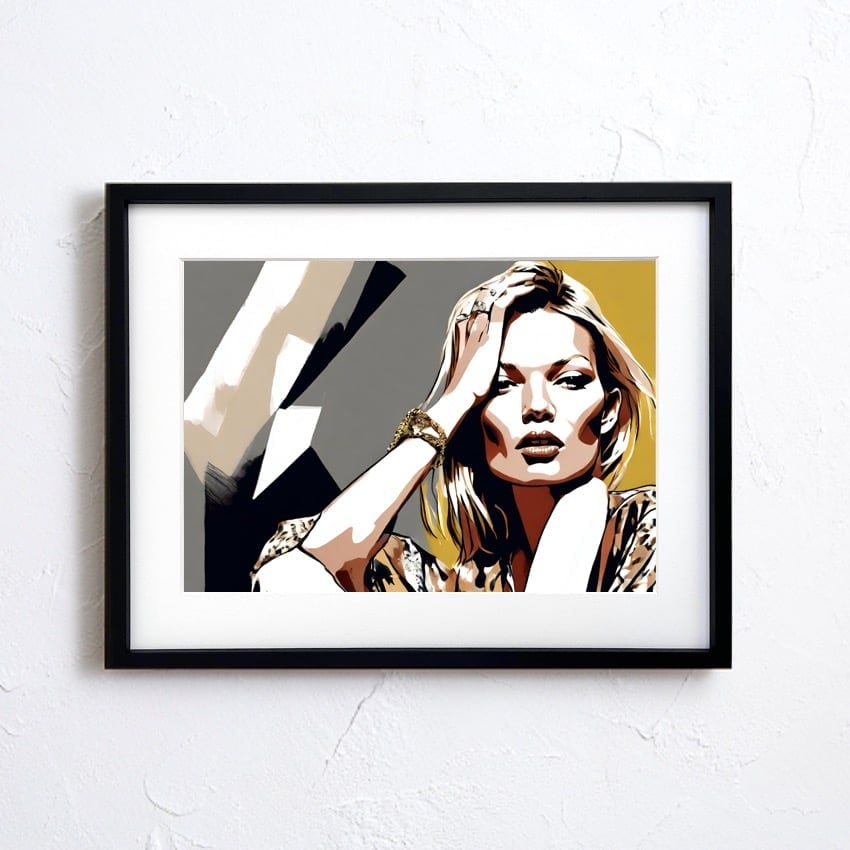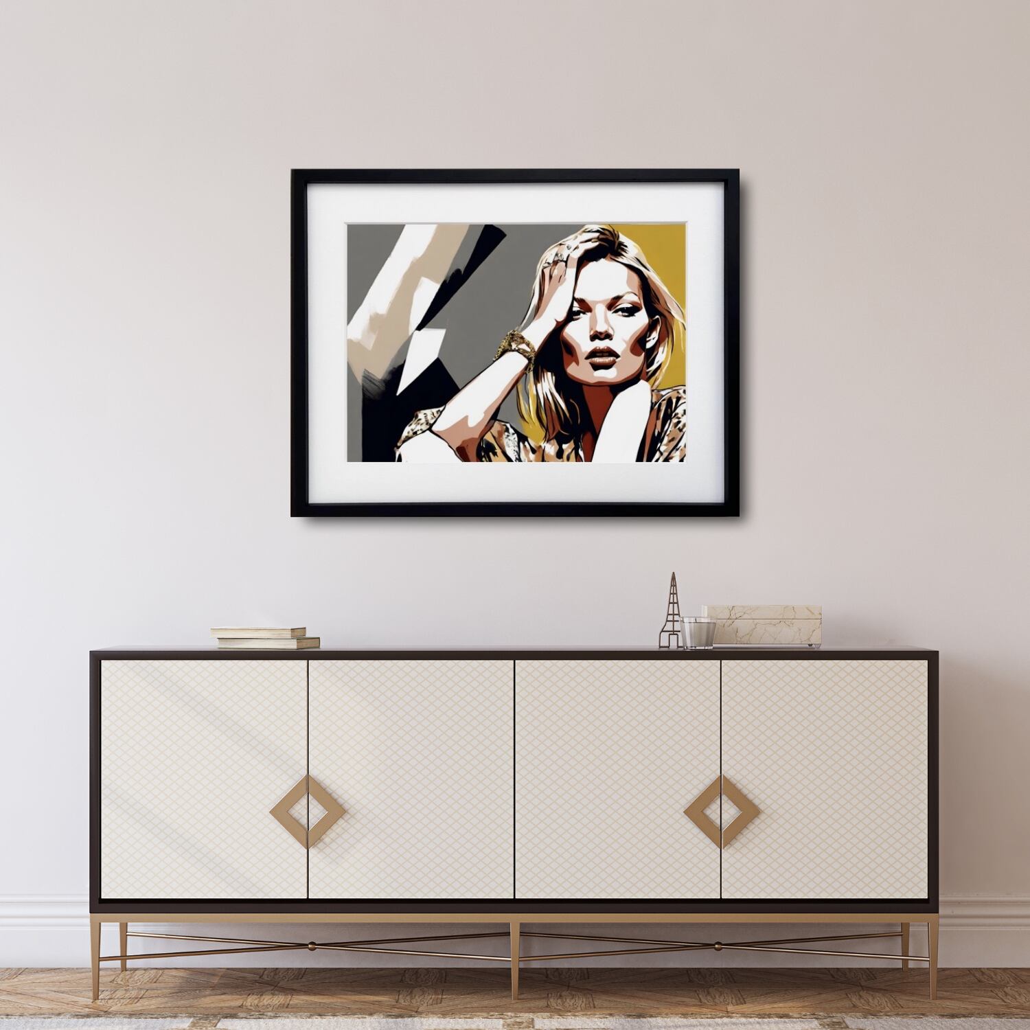 ファッション界の象徴であるケイト・モスに敬意を評し、シンプルかつラグジュアリーな雰囲気でアート表現したポスターです。洗練された表情とモノトーンの美しさが空間に映え、モダンインテリア・ラグジュアリールーム・サロンやショップの壁面演出にもぴったり。