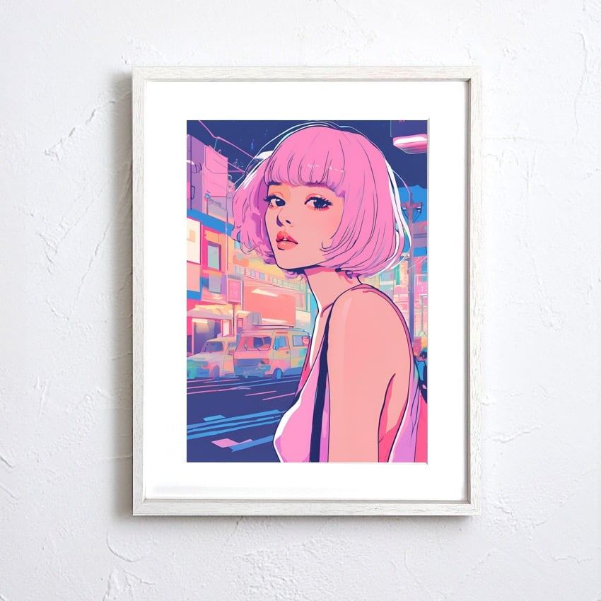 Bob Girl Ⅴ|ピンクヘアが印象的なレトロポップアートポスター|淡いパステルが描くシティポップでおしゃれな空間演出A3ポスター