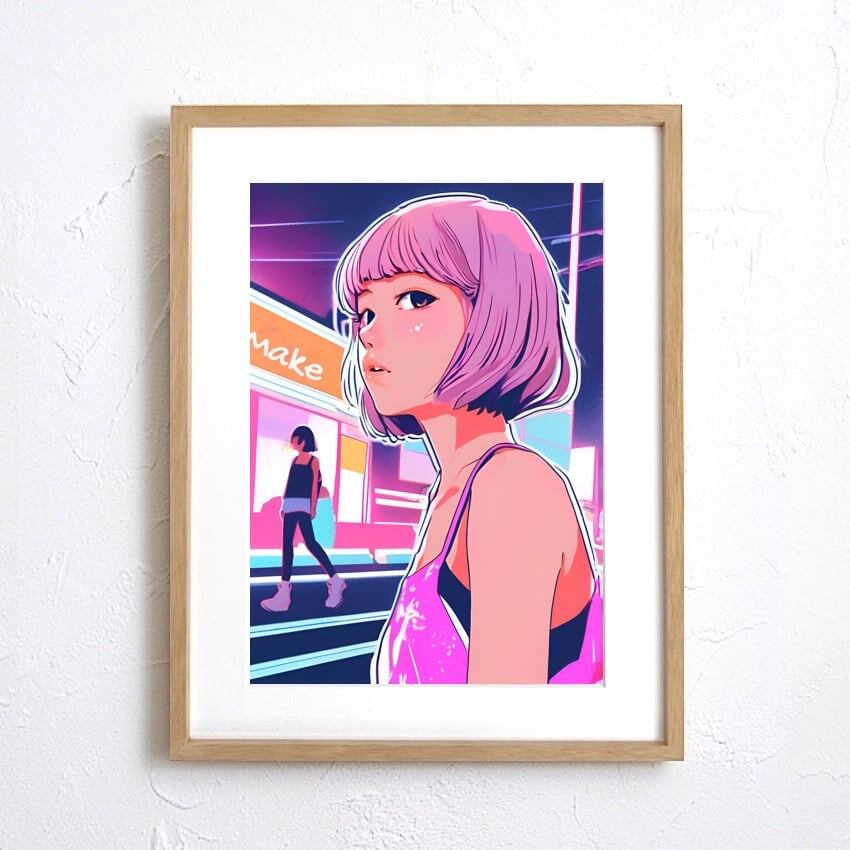 Bob Girl VIII|ピンクヘアが映えるシティポップアートポスター|ノスタルジーと洗練が交差する大人のレトロモダンインテリアA3ポスター