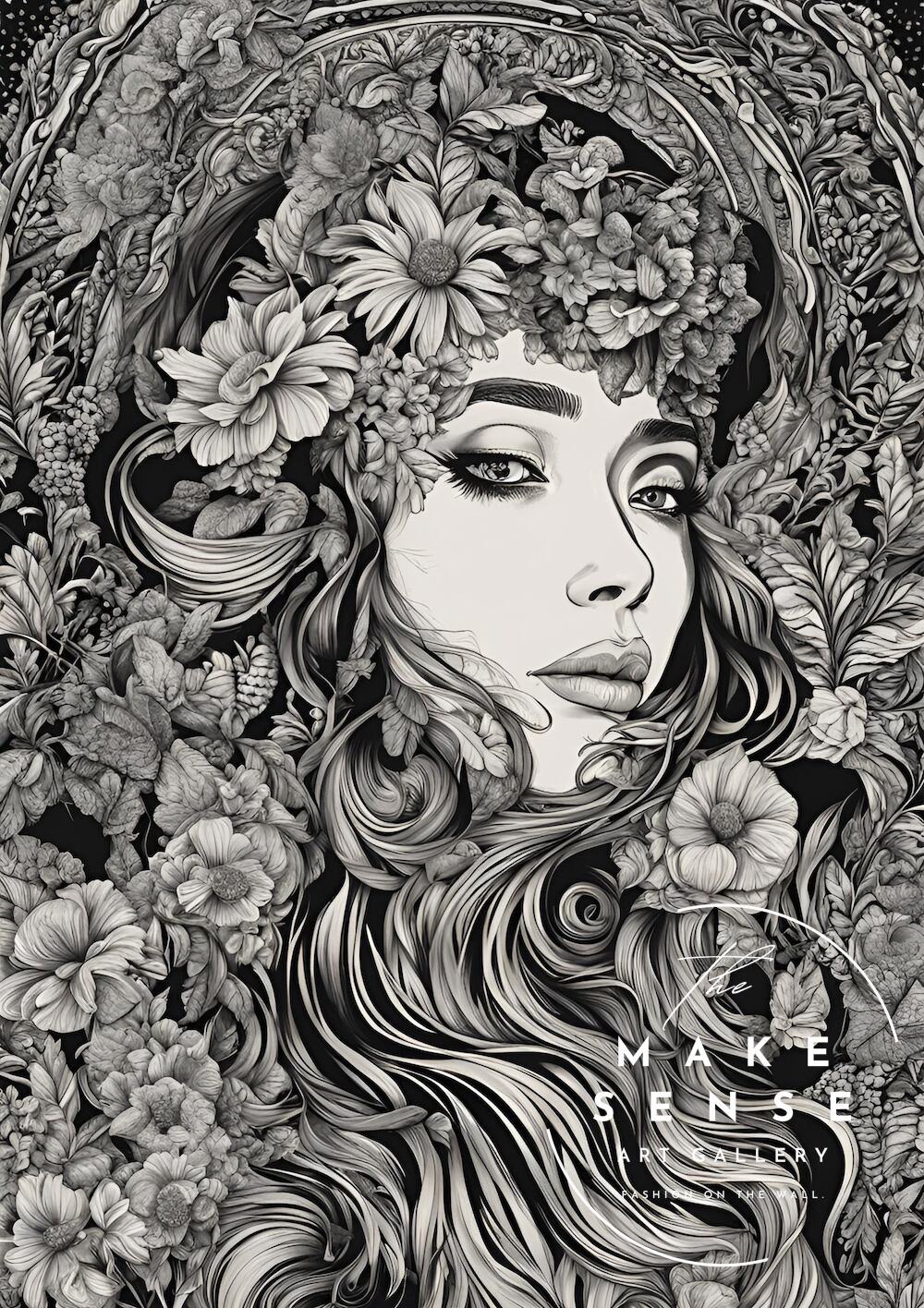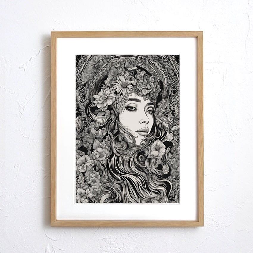 Monochrome Muse|花と女性が織りなす静寂の美|白と黒で描く繊細なラインアートポスター|上質なモノクロの世界A3ポスター