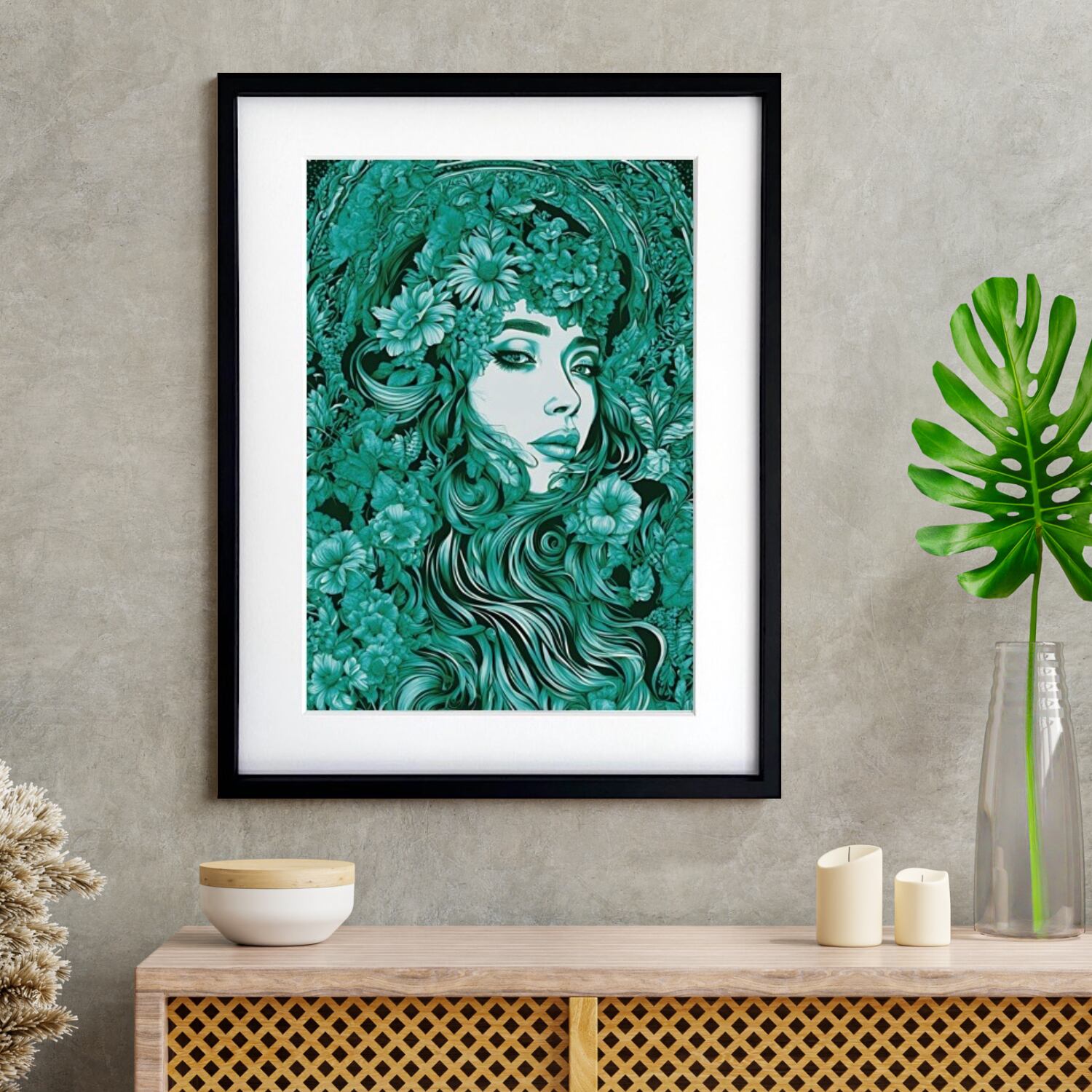 Emerald Muse|花と女性が融合した幻想的アートポスター|癒しと感性を呼び覚ますエメラルドの世界A2ポスター
