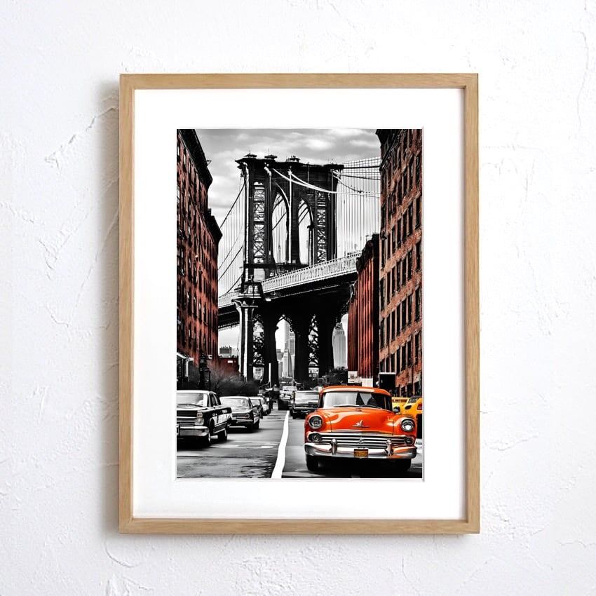 Manhattan Soul Drive|ブルックリンブリッジを駆け抜けるクラシックカーのアートポスター|都会と情熱の融合A4ポスター