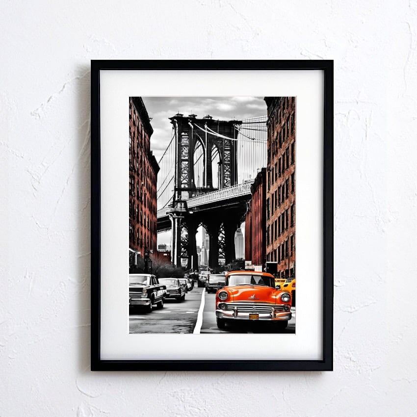 Manhattan Soul Drive|ブルックリンブリッジを駆け抜けるクラシックカーのアートポスター|都会と情熱の融合A3ポスター