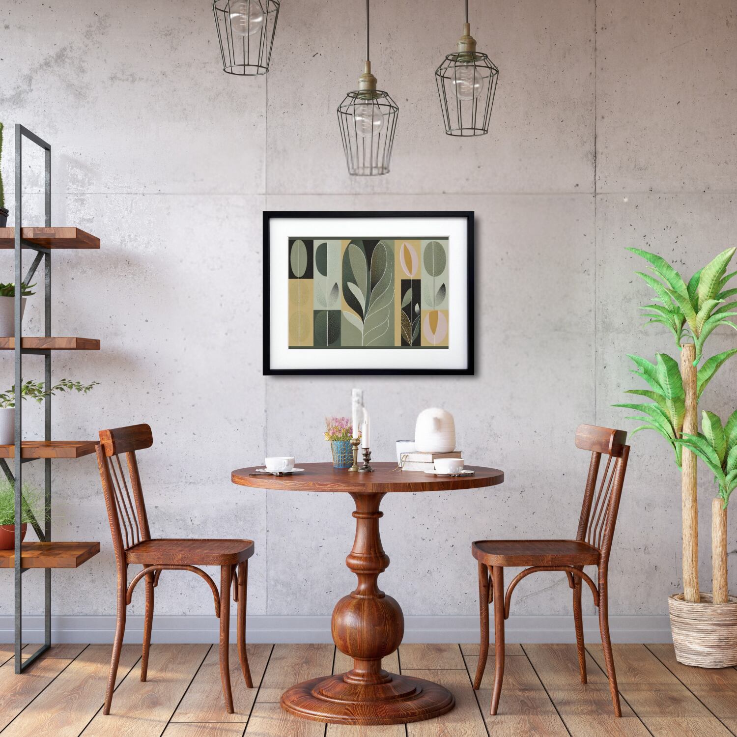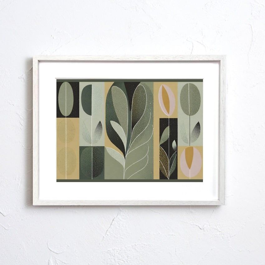植物の有機的なフォルムと幾何学的なリズムが融合した、モダンボタニカルアートポスター。