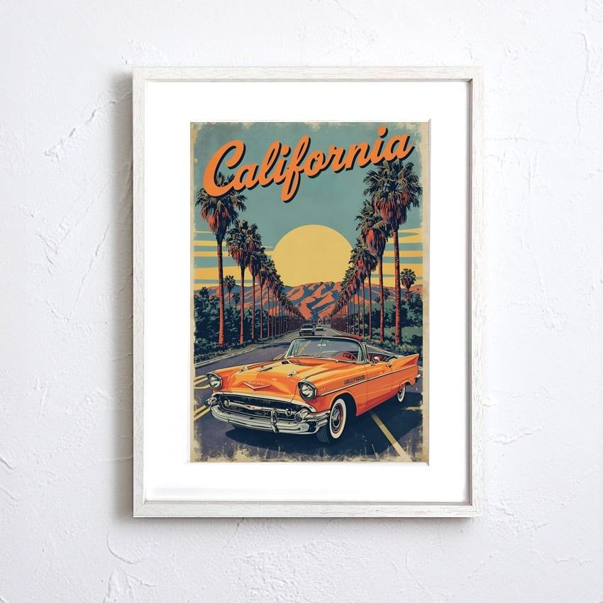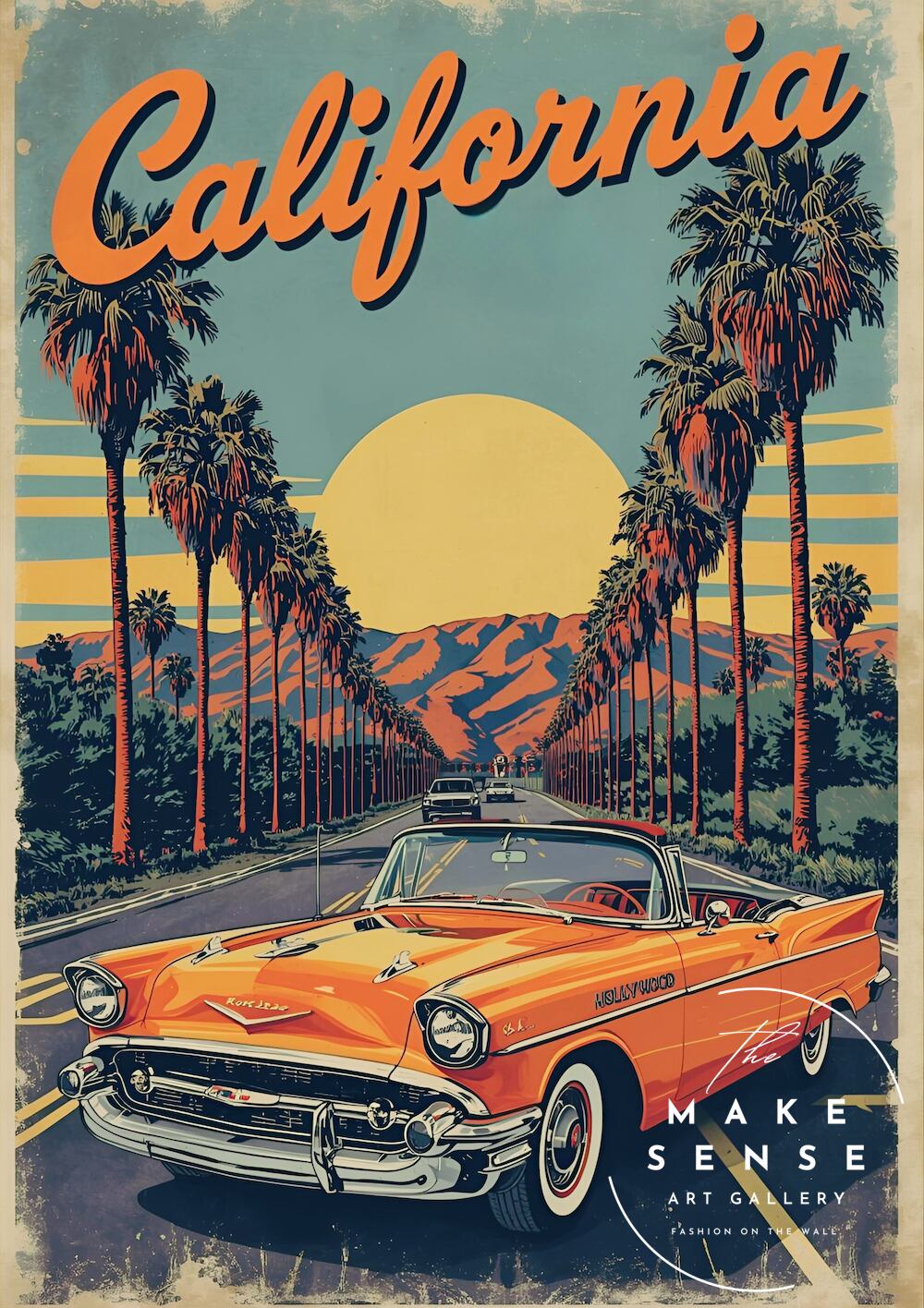 California Dreamin’|カリフォルニアの陽光とクラシックカーが描く自由のアートポスター|レトロモダンな空間を彩るインテリアA2ポスター