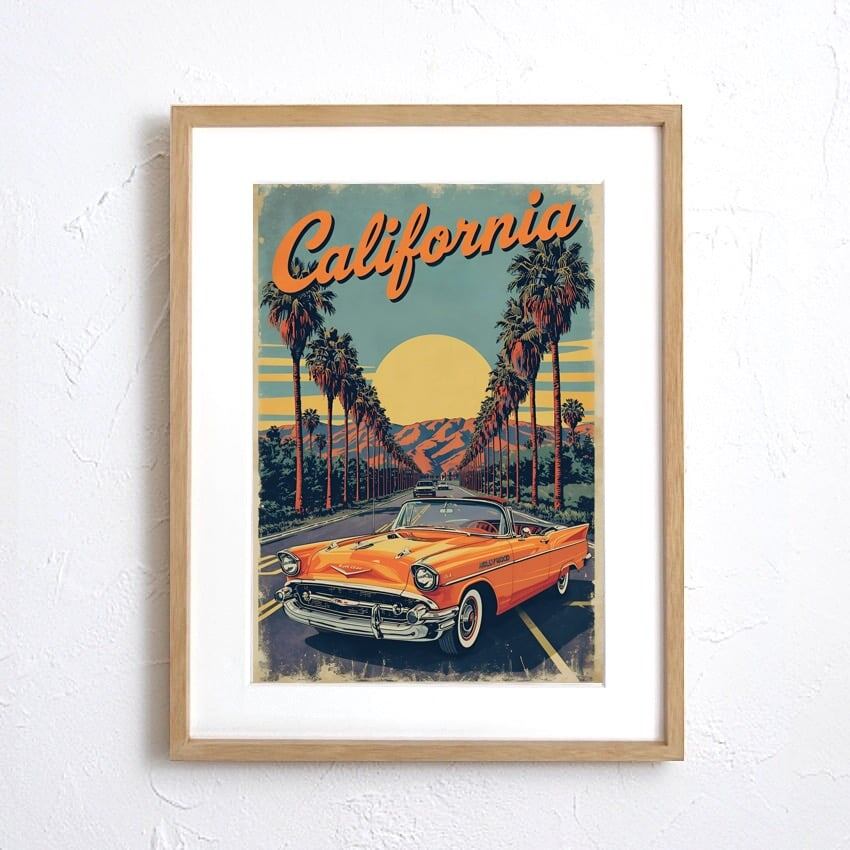 California Dreamin’|カリフォルニアの陽光とクラシックカーが描く自由のアートポスター|レトロモダンな空間を彩るインテリアA3ポスター