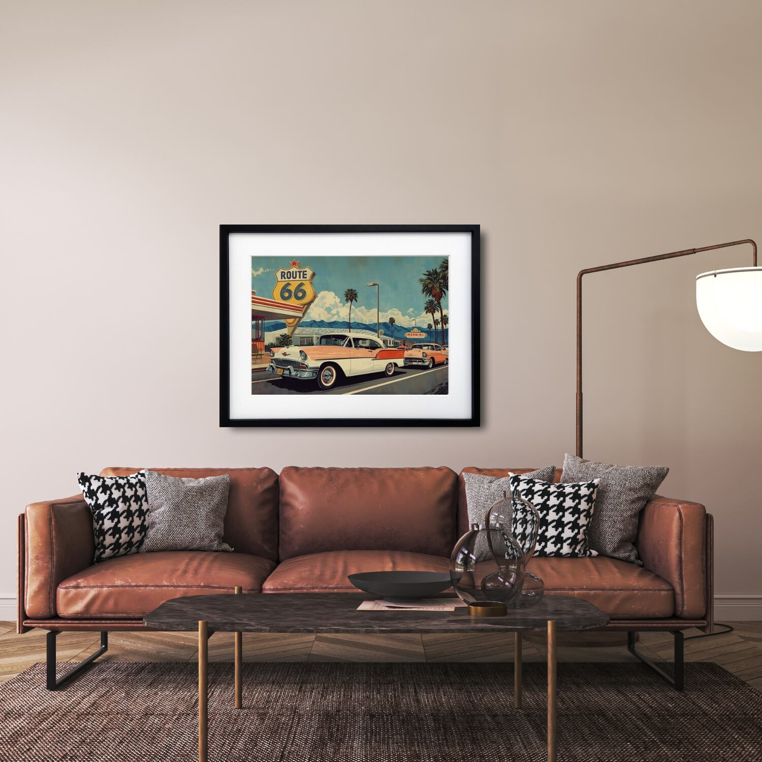 1950年代、自由の象徴として多くの人が憧れたルート66。その風景を、現代的な色彩バランスで再構築しました。