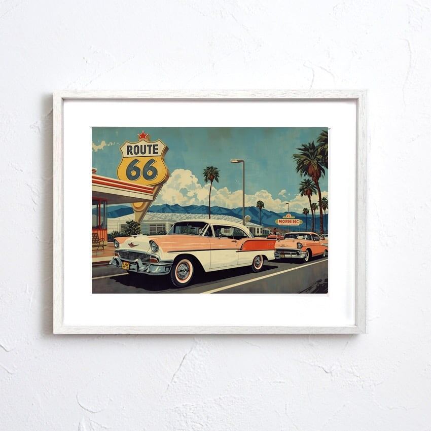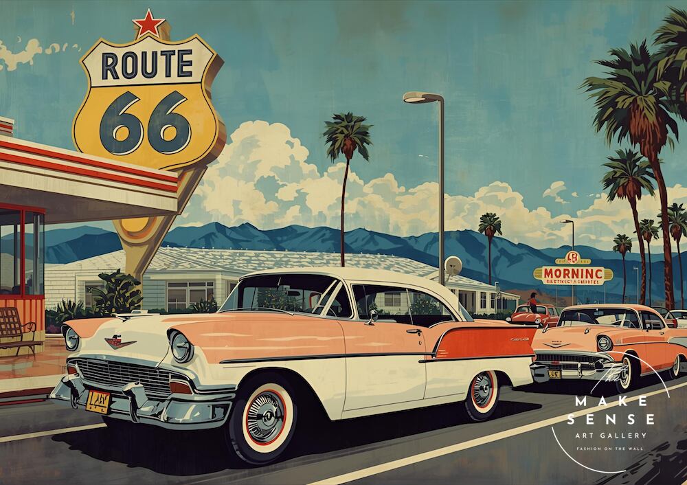 Route 66 Nostalgia|クラシックカーが走るアメリカンハイウェイを描いたポスター|懐かしさと自由が響くヴィンテージインテリアA2ポスター