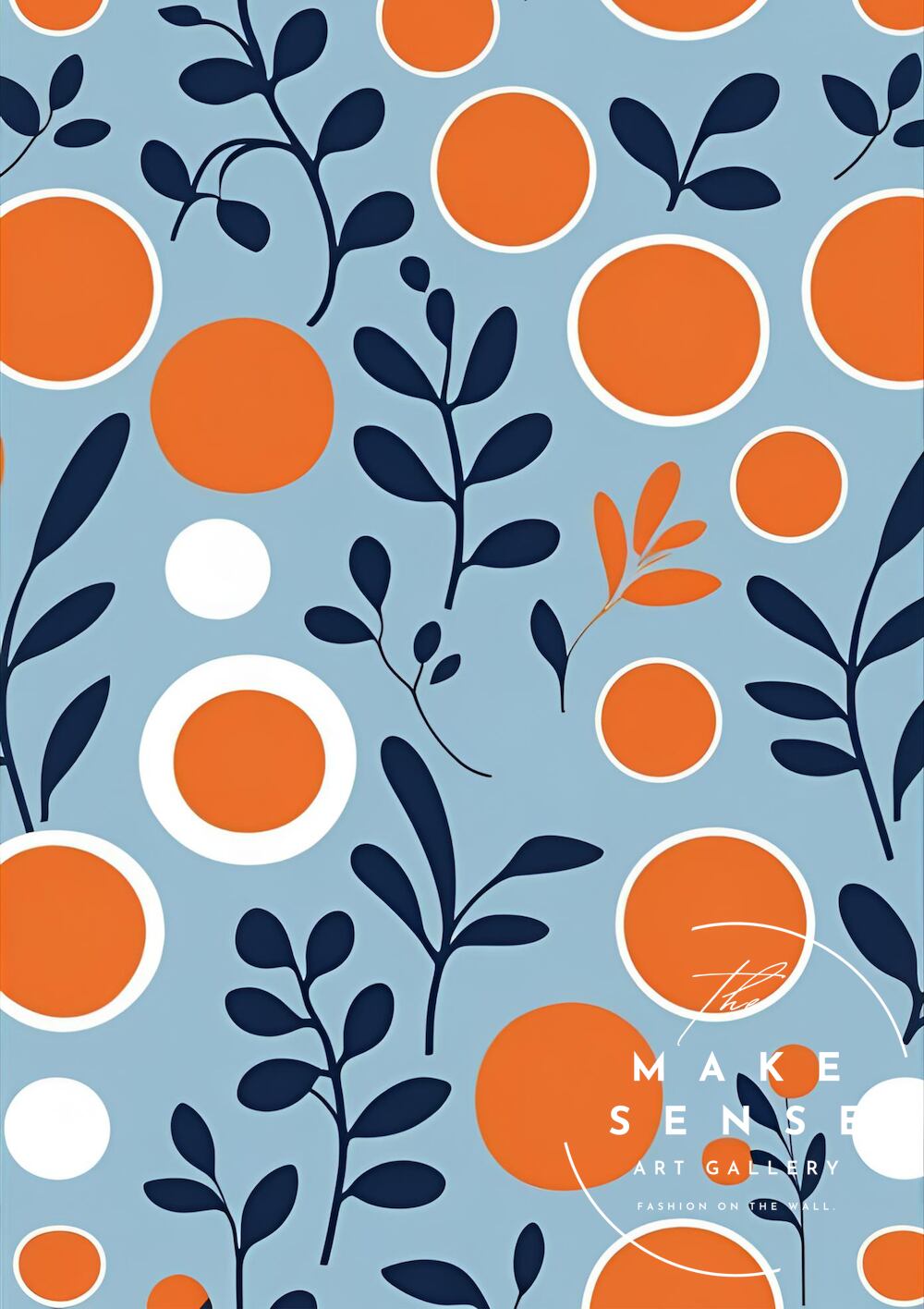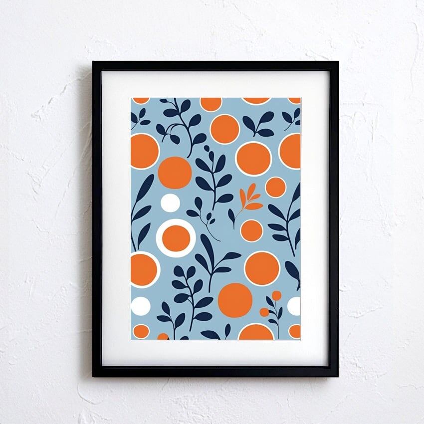 『Orange Bloom(オレンジ・ブルーム)』は、鮮やかなオレンジの丸とリズミカルなリーフモチーフが軽やかに踊る、北欧テイストのモダンアートポスターです。