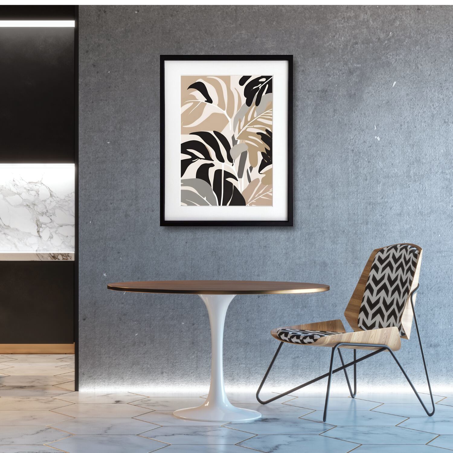 このアートポスター「Metallic Monstera(メタリック・モンステラ)」は、自然の造形美であるモンステラの葉を、モダンでスタイリッシュなシルバーやメタリック調で再構築した一枚です。落ち着いたベージュとブラックのコントラストに、メタリックな輝きが加わることで、洗練された高級感を演出。まるで葉脈がアクセサリーのように煌めき、インテリアに上質な存在感を与えます。