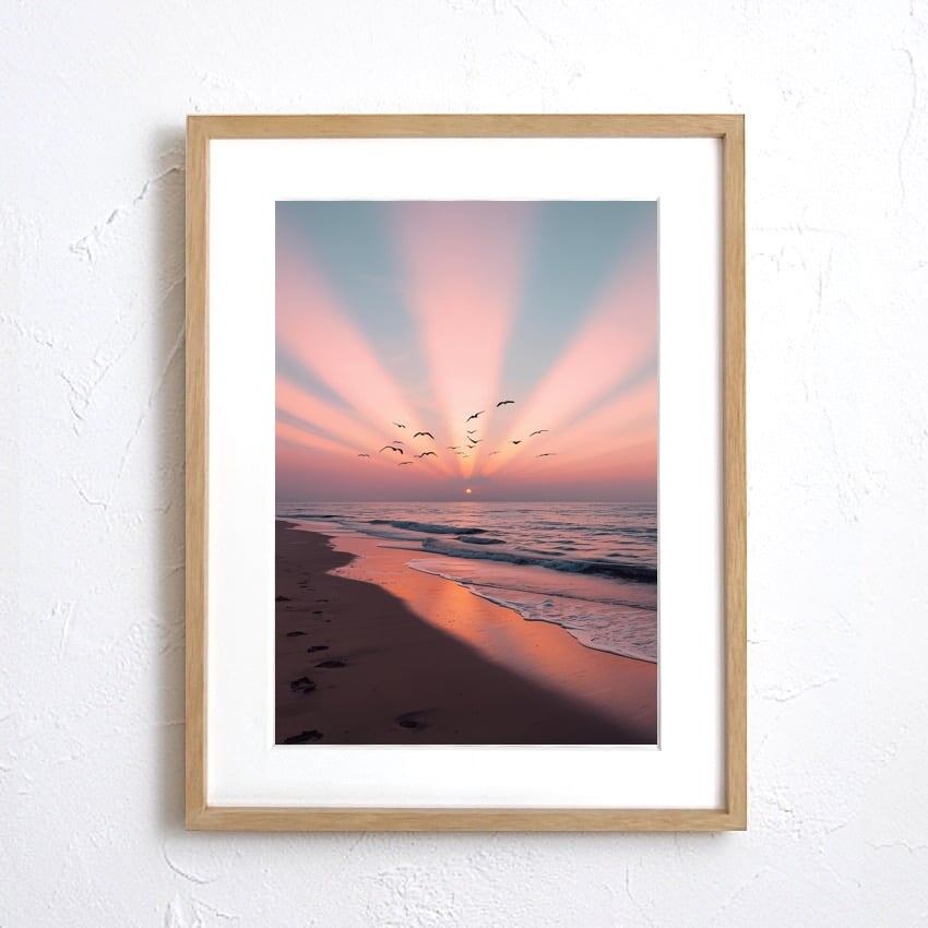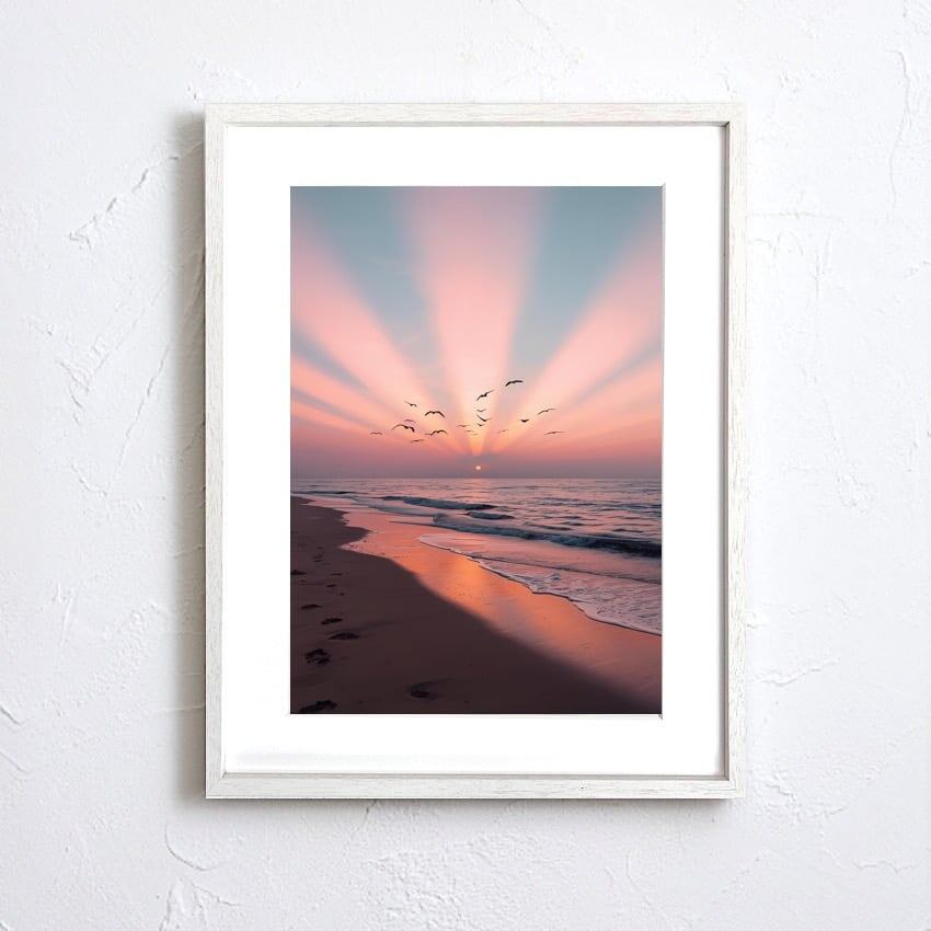 海辺に差し込む夕陽の光が放射状に広がり、幻想的なグラデーションの空を映し出すアートポスター。波打ち際には人々が歩いた足跡が残され、その向こうに群れを成して飛ぶ鳥たちが未来へと羽ばたく瞬間を描いています。