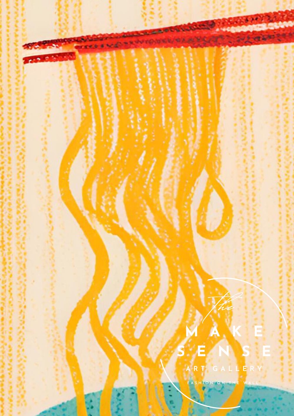 食卓の楽しさを大胆にポップに切り取った本作「Noodle Flow(ヌードル・フロー)」は、流れるように描かれた麺のラインがリズムを刻むように画面を支配する、ユーモラスでエネルギッシュな一枚です。鮮やかなオレンジの線は“麺”であると同時に、人生の流れや時間の躍動を象徴し、見る人に元気や遊び心を与えてくれます。
