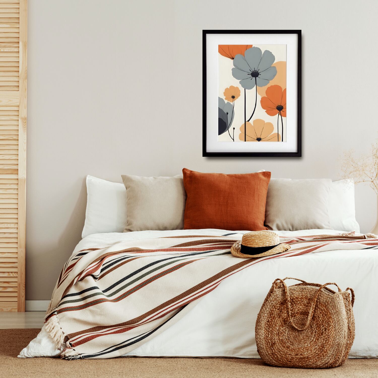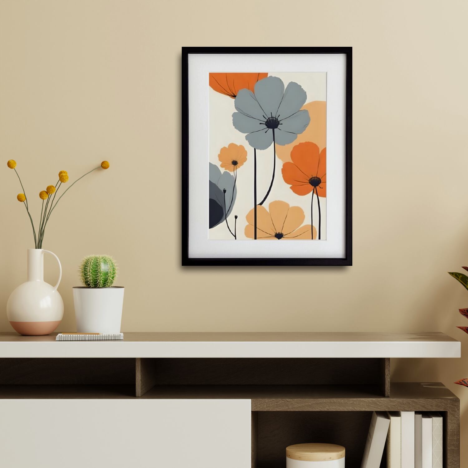 「ポピー・ハーモニー」は、オレンジとグレーのポピーが織りなす繊細で力強い美しさを表現したアートポスターです。