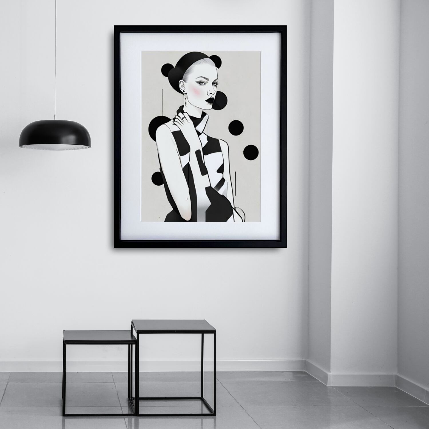 北欧風の洗練されたモノクロとドットが融合したこのアートポスターは、ミニマルで現代的な空間にぴったりのアクセントとなります。女性のシルエットを大胆な線と抽象的な要素で描き、エレガントでありながらユニークな雰囲気を演出します。