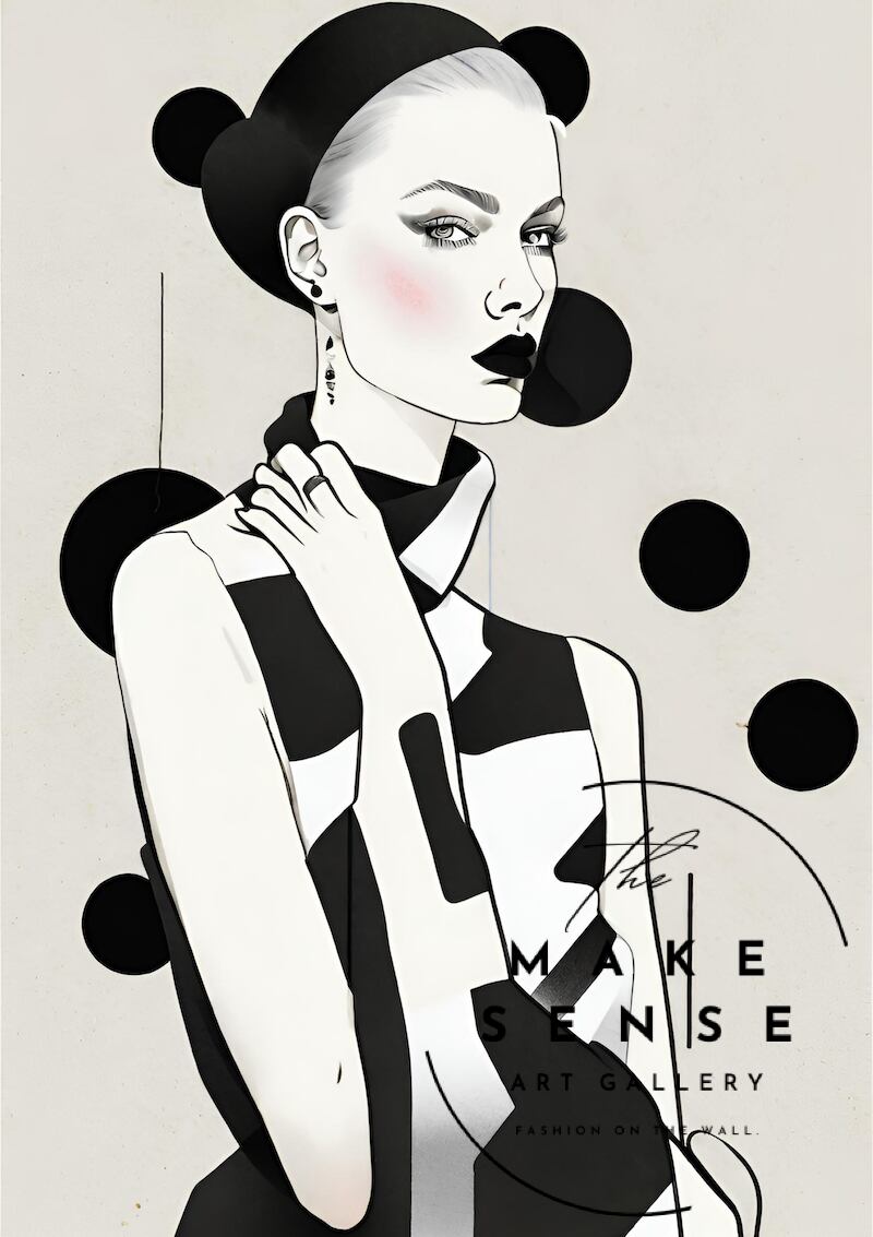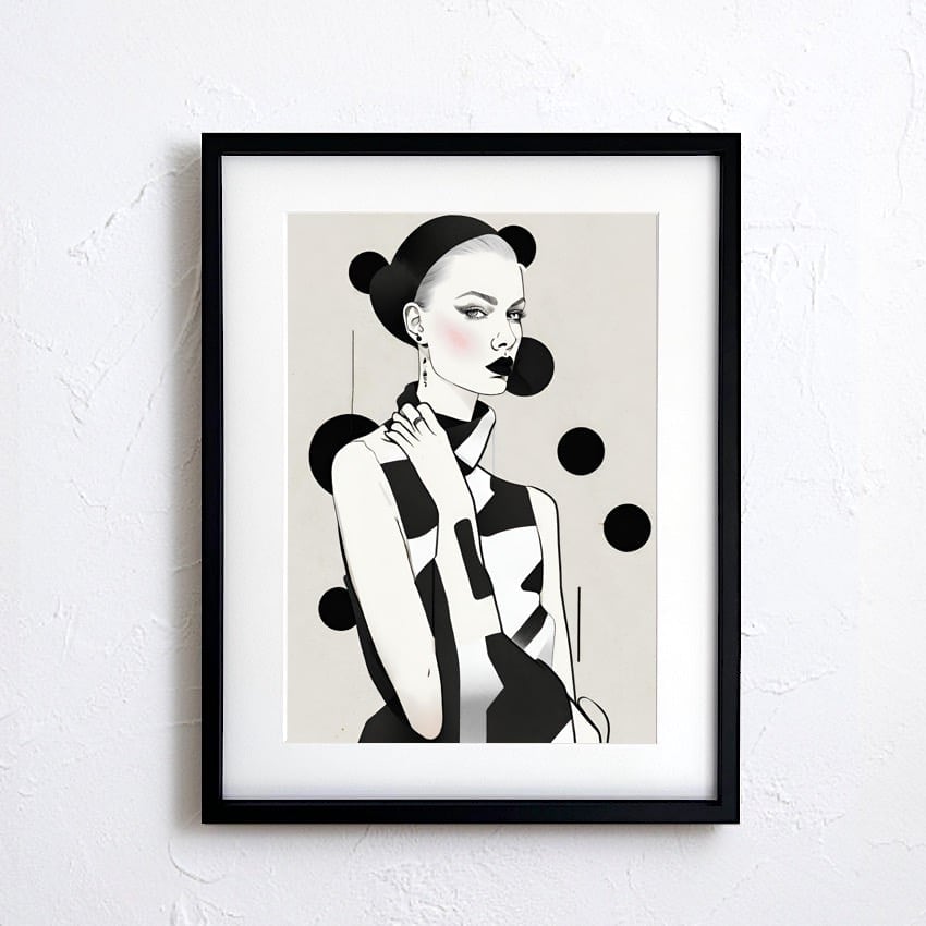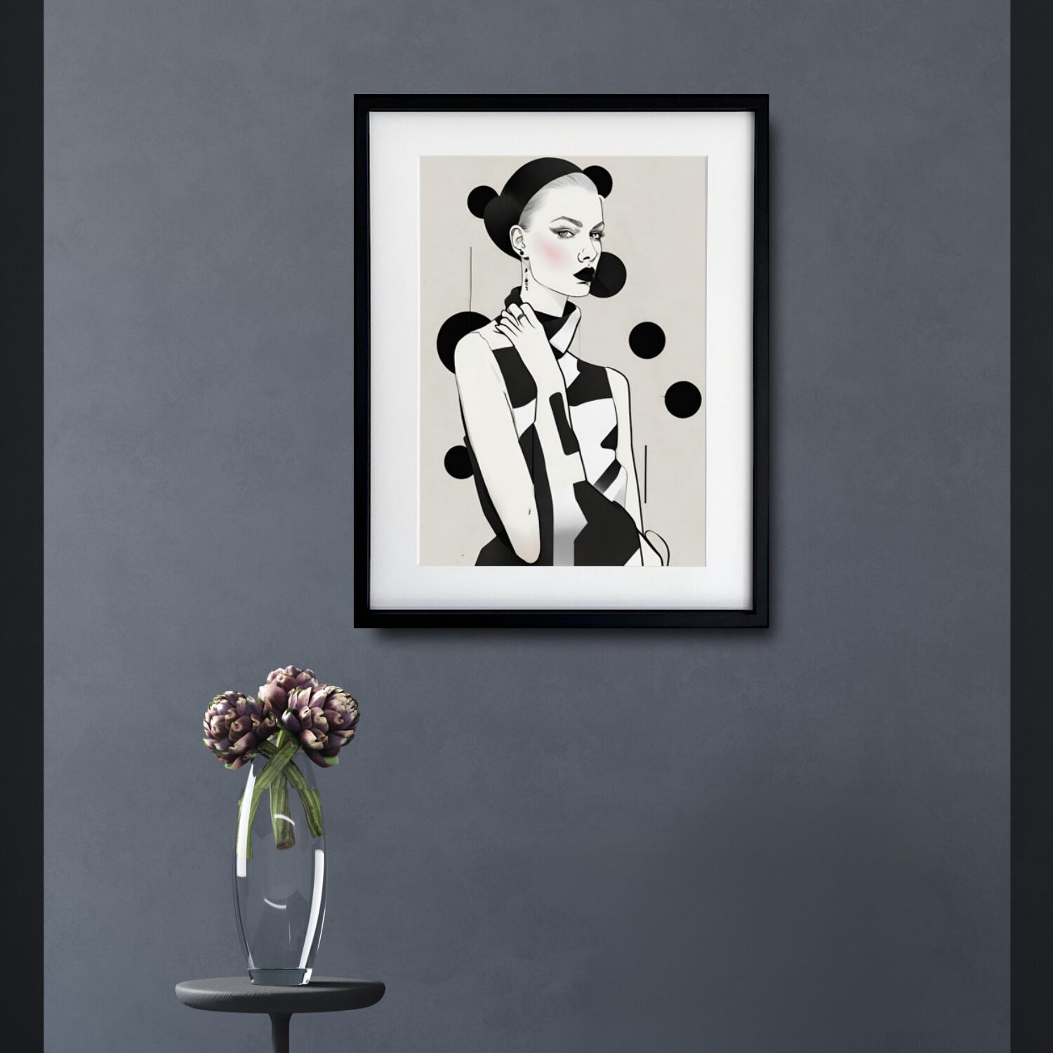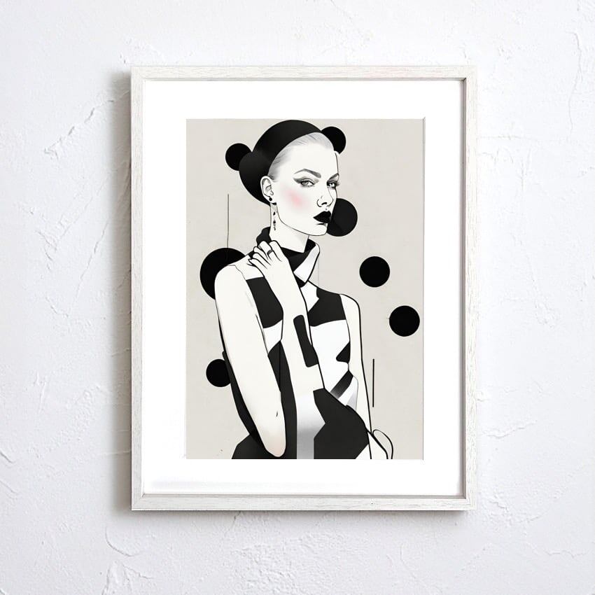 北欧風の洗練されたモノクロとドットが融合したこのアートポスターは、ミニマルで現代的な空間にぴったりのアクセントとなります。女性のシルエットを大胆な線と抽象的な要素で描き、エレガントでありながらユニークな雰囲気を演出します。