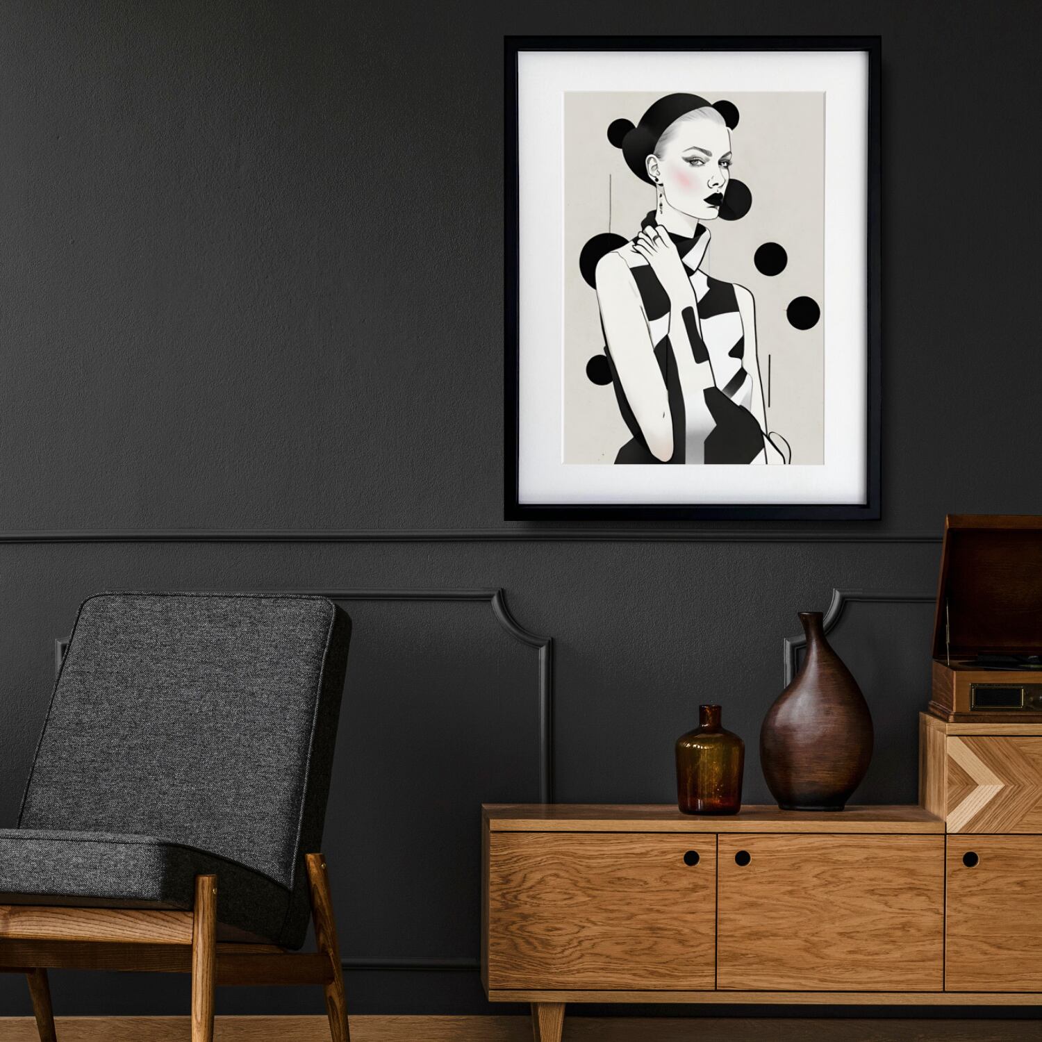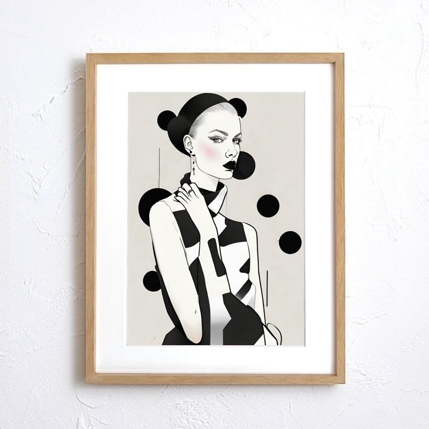 北欧風の洗練されたモノクロとドットが融合したこのアートポスターは、ミニマルで現代的な空間にぴったりのアクセントとなります。女性のシルエットを大胆な線と抽象的な要素で描き、エレガントでありながらユニークな雰囲気を演出します。