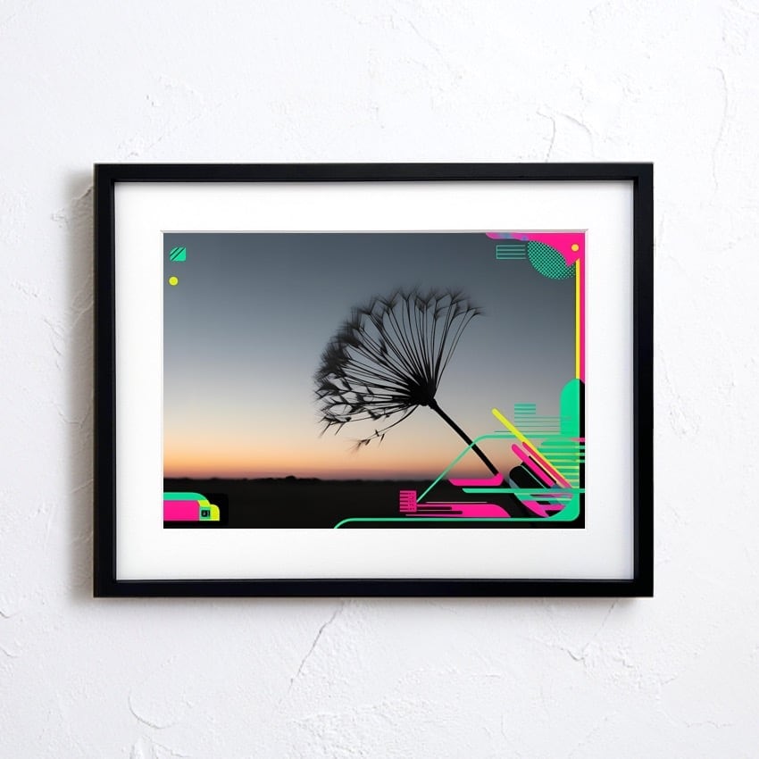 黄昏の空に浮かぶタンポポの綿毛をシルエットで捉え、未来的なネオンカラーの幾何学模様を融合させた『Neon Breeze』。