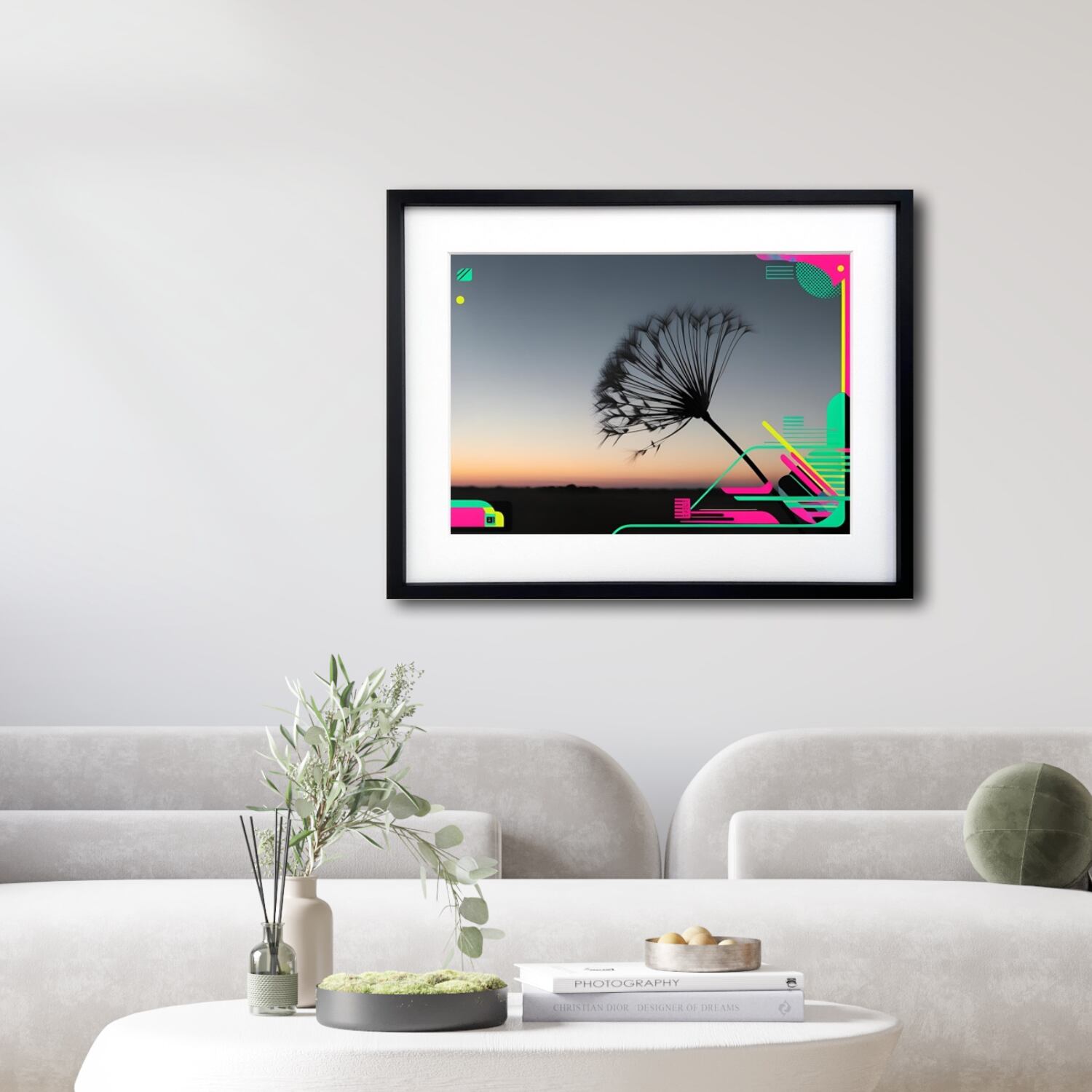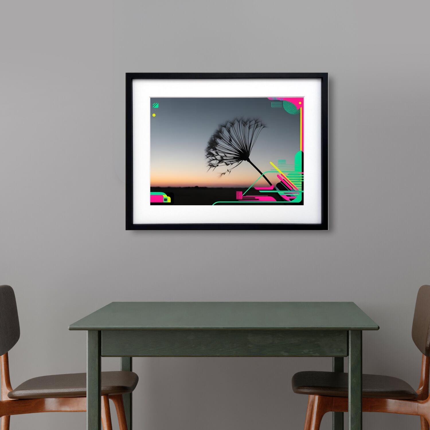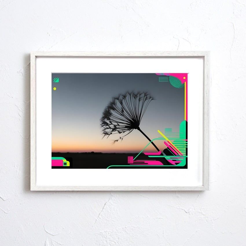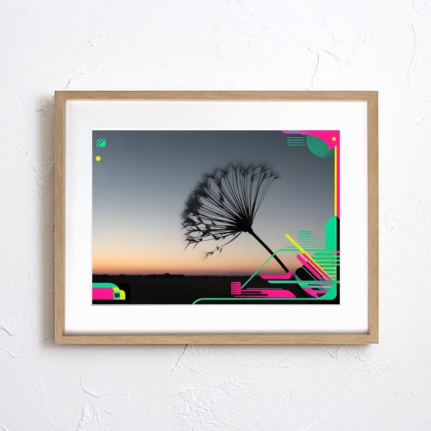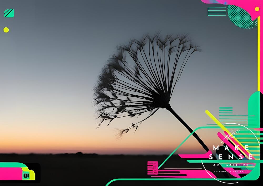 黄昏の空に浮かぶタンポポの綿毛をシルエットで捉え、未来的なネオンカラーの幾何学模様を融合させた『Neon Breeze』。