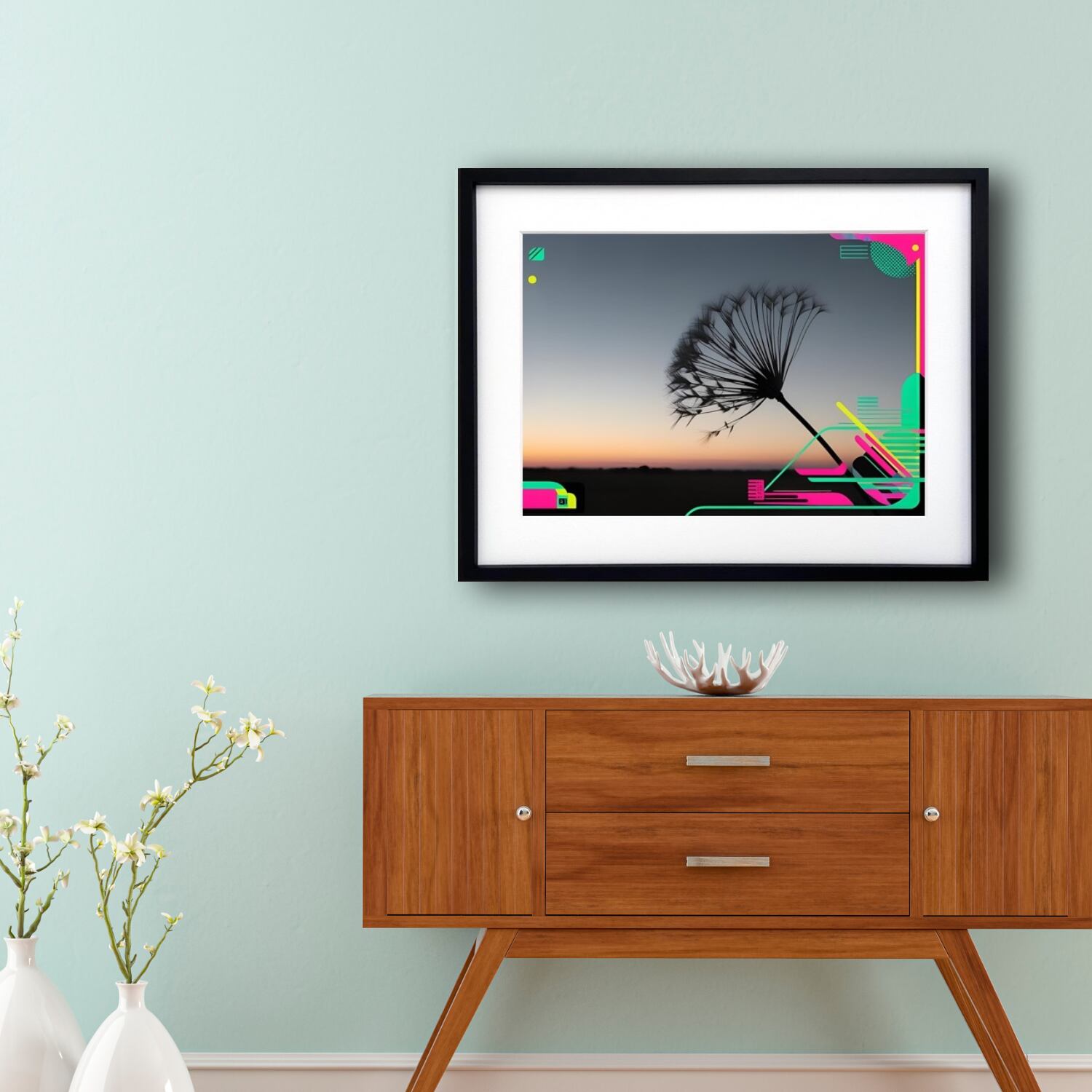 黄昏の空に浮かぶタンポポの綿毛をシルエットで捉え、未来的なネオンカラーの幾何学模様を融合させた『Neon Breeze』。