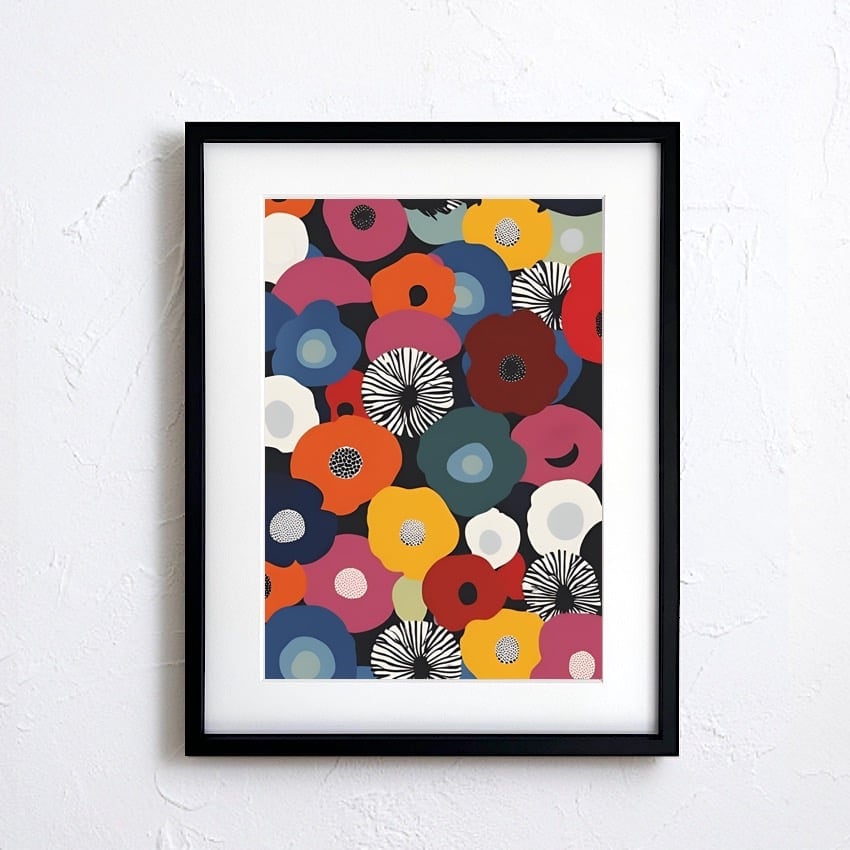 「Colorful Bloom」は、色とりどりの花々がキャンバスいっぱいに咲き誇るようなデザインのアートポスターです。鮮やかなイエロー、レッド、ブルー、ピンク、ブラックが織りなす大胆な配色は、ポップアートやモダンアートの要素を感じさせ、空間にリズムと華やかさをプラスします。