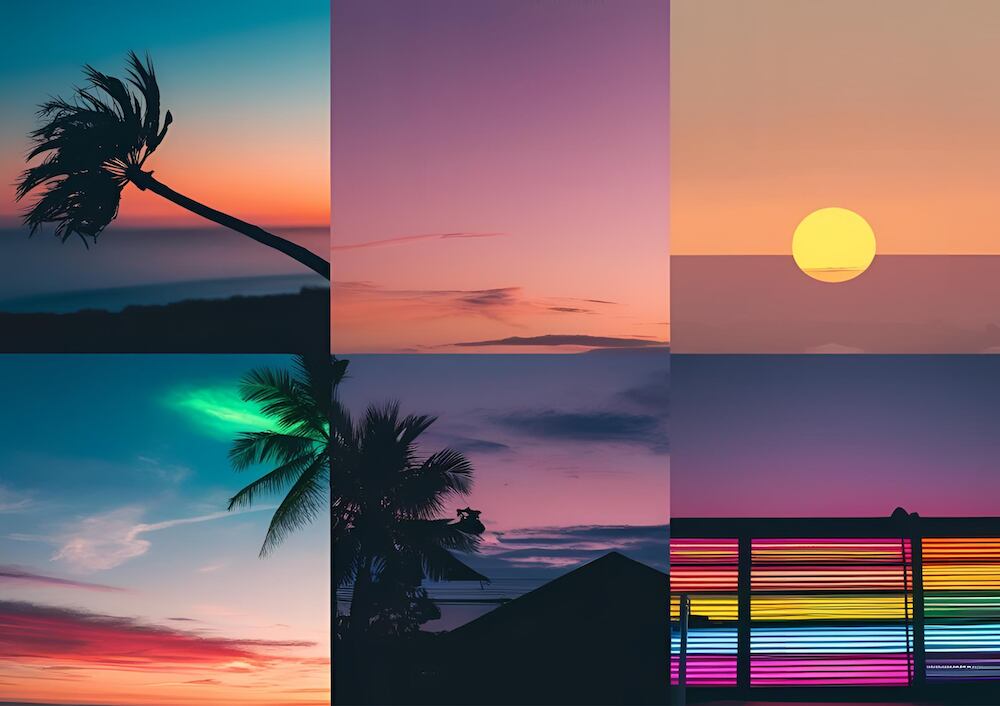「Tropical Neon Sunset」は、南国のサンセットとネオンカラーの幻想的な融合を描いたアートポスターです。柔らかな夕焼け空に浮かぶヤシの木、鮮やかなネオンの光が交錯し、まるで現実と夢の境界線を漂うような特別な時間を切り取っています。