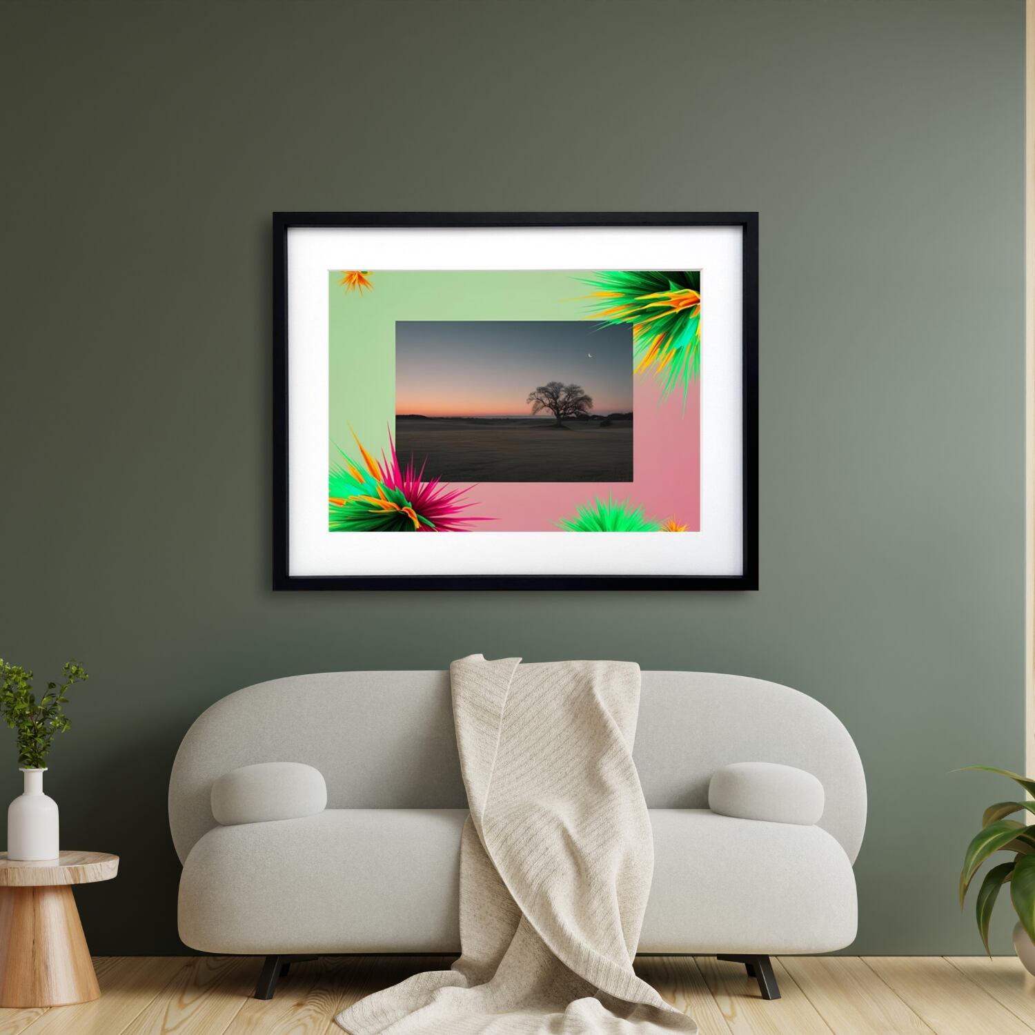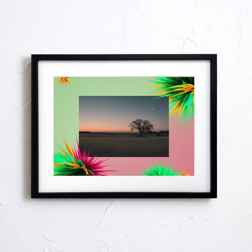 フレームを彩る鮮やかなグリーンとピンクの抽象的な装飾は、現実と幻想を繋ぐ架け橋のよう。落ち着いた風景の中に差し込まれるポップなエネルギーが、モダンインテリアに映えるアクセントとなります。