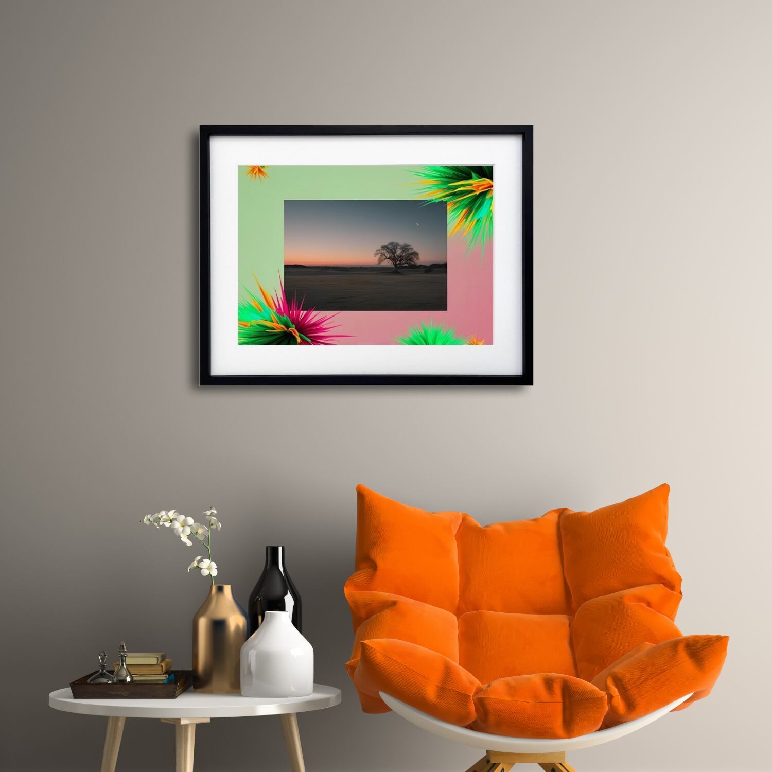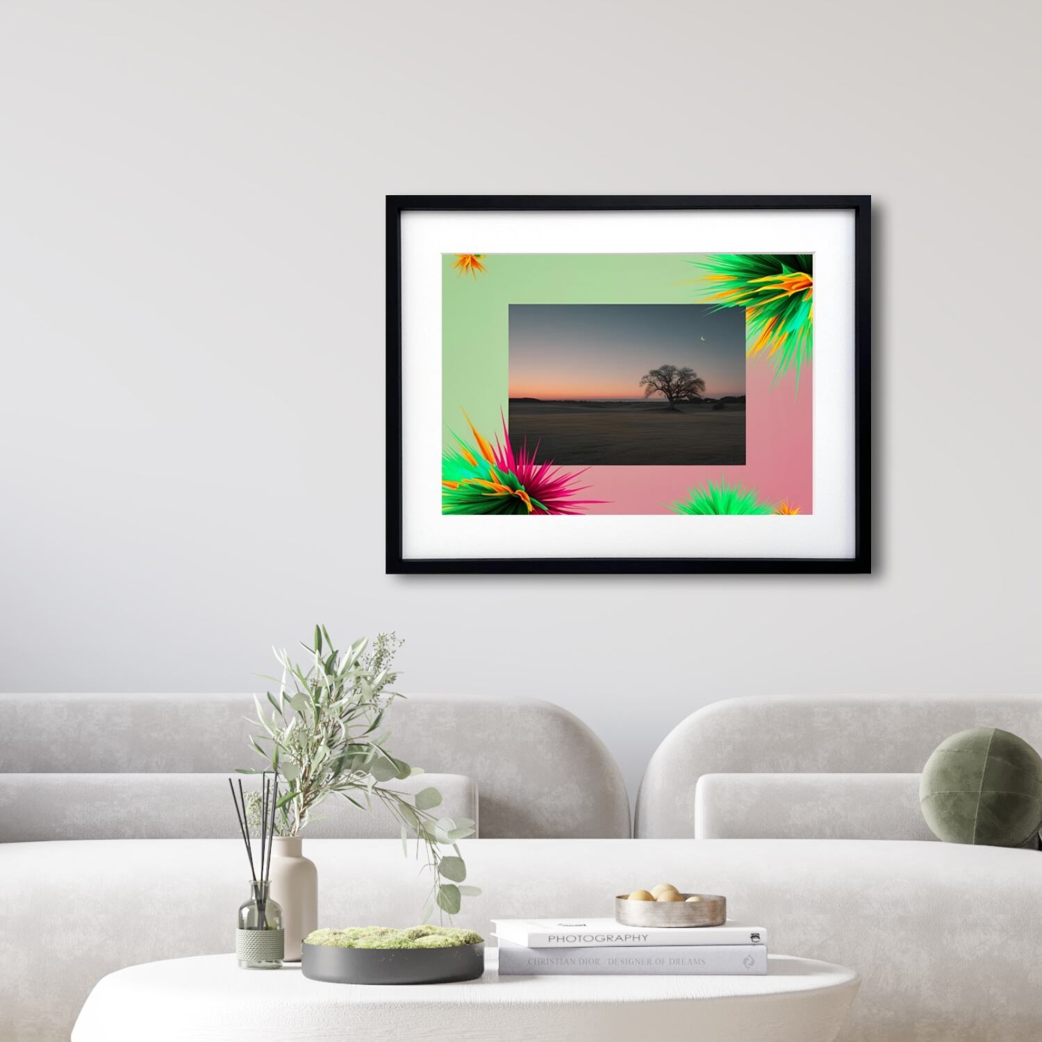 フレームを彩る鮮やかなグリーンとピンクの抽象的な装飾は、現実と幻想を繋ぐ架け橋のよう。落ち着いた風景の中に差し込まれるポップなエネルギーが、モダンインテリアに映えるアクセントとなります。