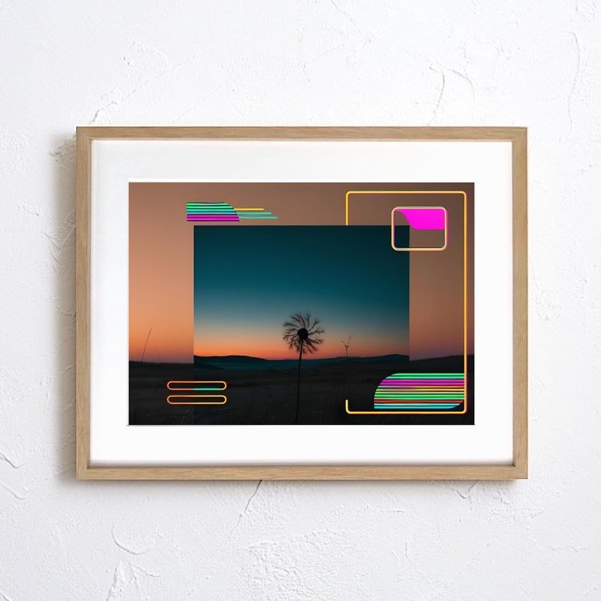 夕暮れに浮かび上がるタンポポのシルエットが、時間の流れと儚い生命の瞬間を象徴。その周囲を彩るネオンカラーの幾何学パターンは、まるでサイバーパンク的な世界を切り取ったかのように鮮烈で、インテリアに強烈なインパクトを与えます。