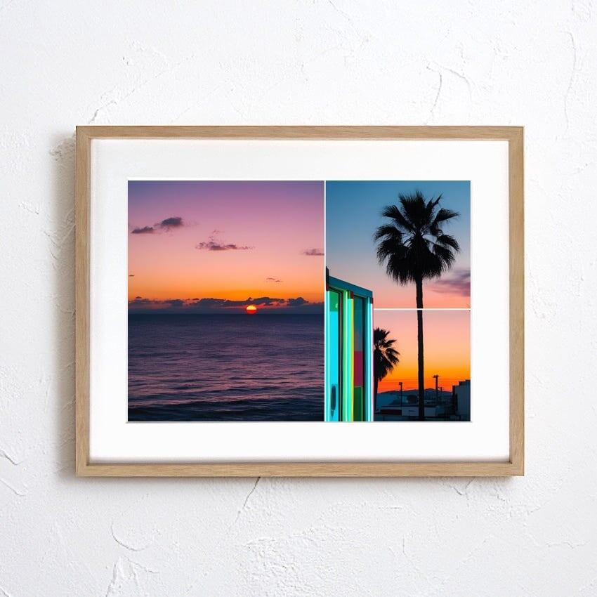 「Sunset & Neon Palm」は、地平線に沈む夕日とヤシの木、そして鮮やかなネオンカラーの建築が重なり合うことで生まれた、現代的で幻想的な風景アートです。
