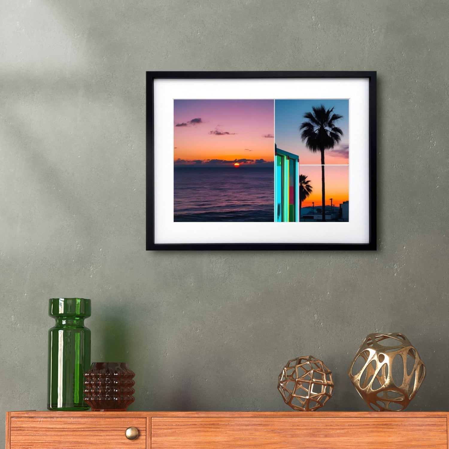 『Sunset & Neon Palm』は、自然と都市の美しさを1枚のキャンバスに閉じ込めた、非日常感溢れるアートポスターです。