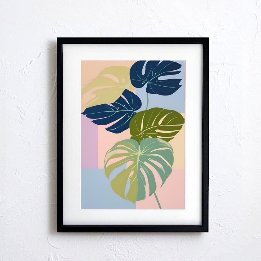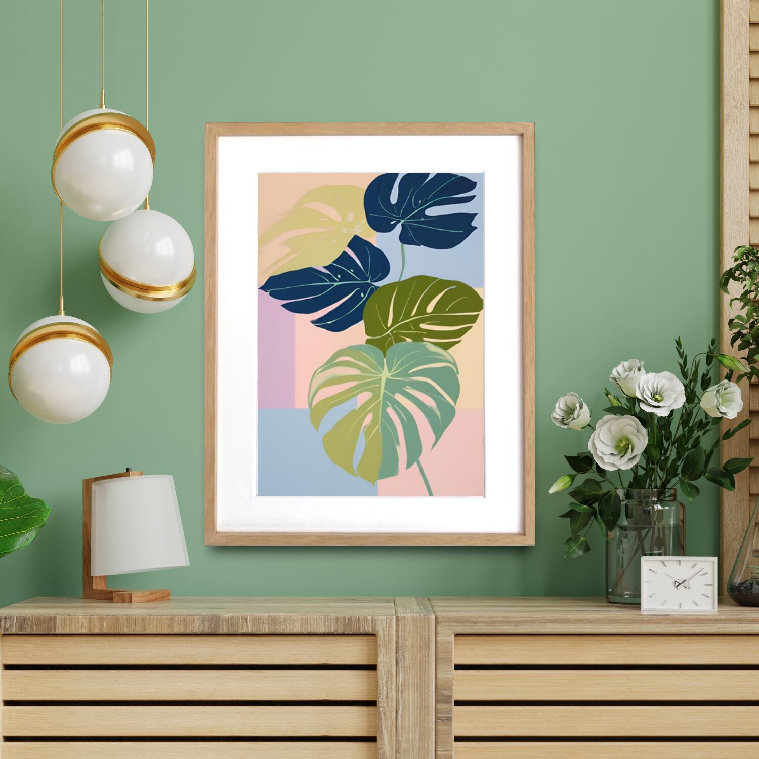 『Monstera Breeze』は、南国の風を感じさせるモンステラの葉を、洗練された色彩と構成で描いたボタニカルアートポスターです。